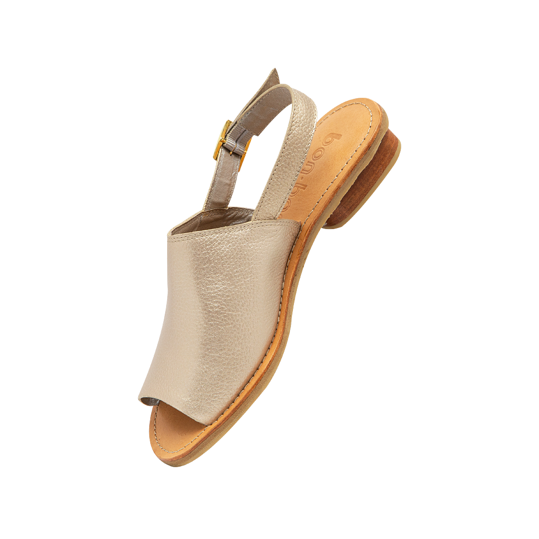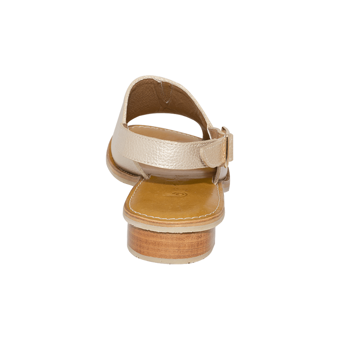 ¡Básicas y a la moda! • Sandalias planas color oro nuevo • Cuero napa • Tacón bajo de 1 ½ cm • Hebilla lateral para un mejor ajuste • Plantilla en cuero • Placa con la letra “b” de nuestro logo • Suela en caucho para mayor confort • Hecho a mano en Colombia.