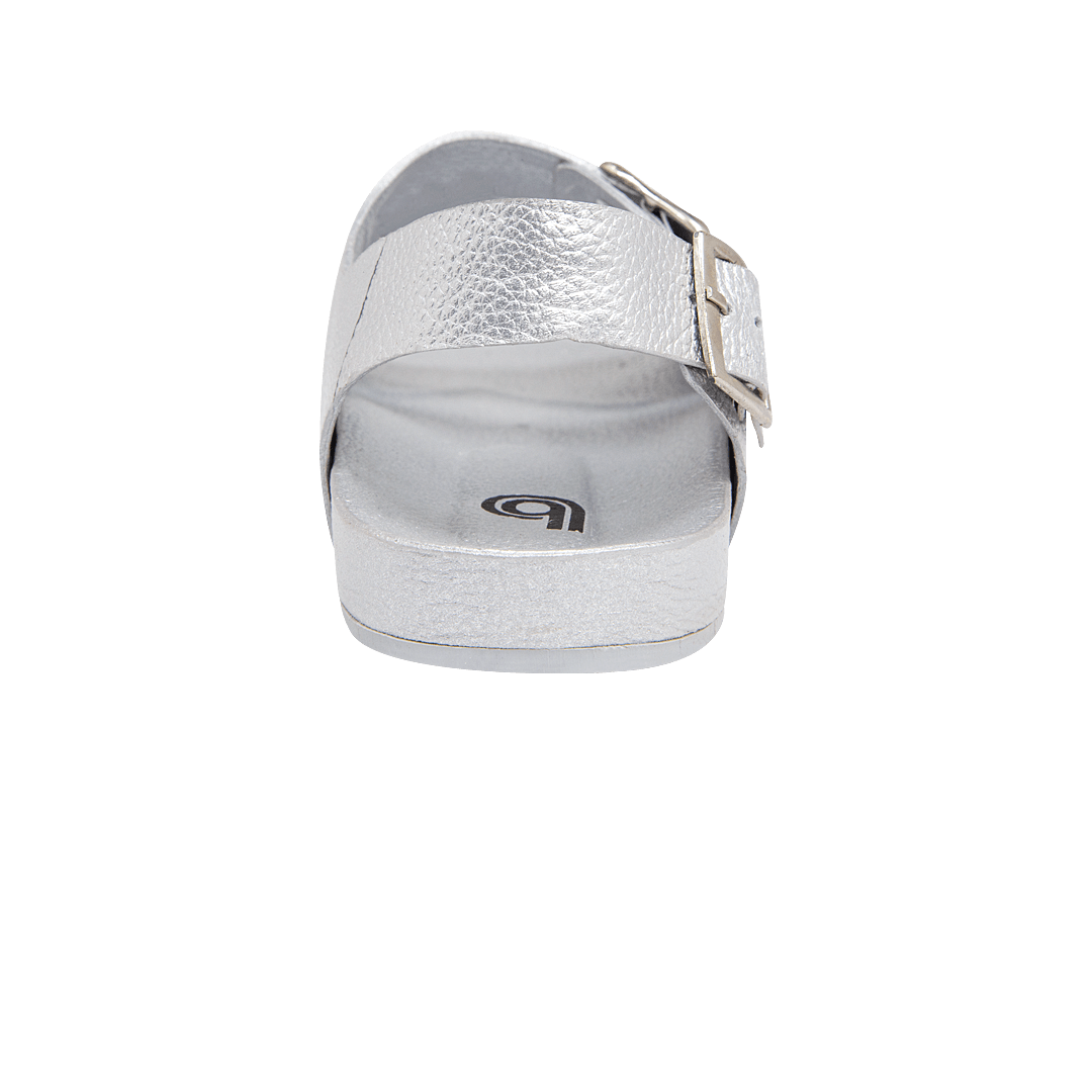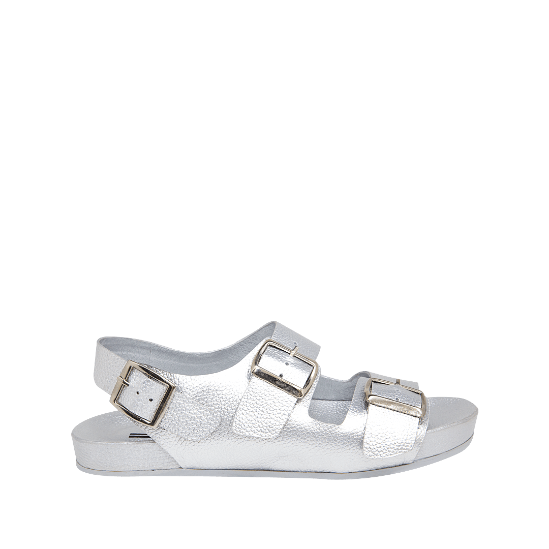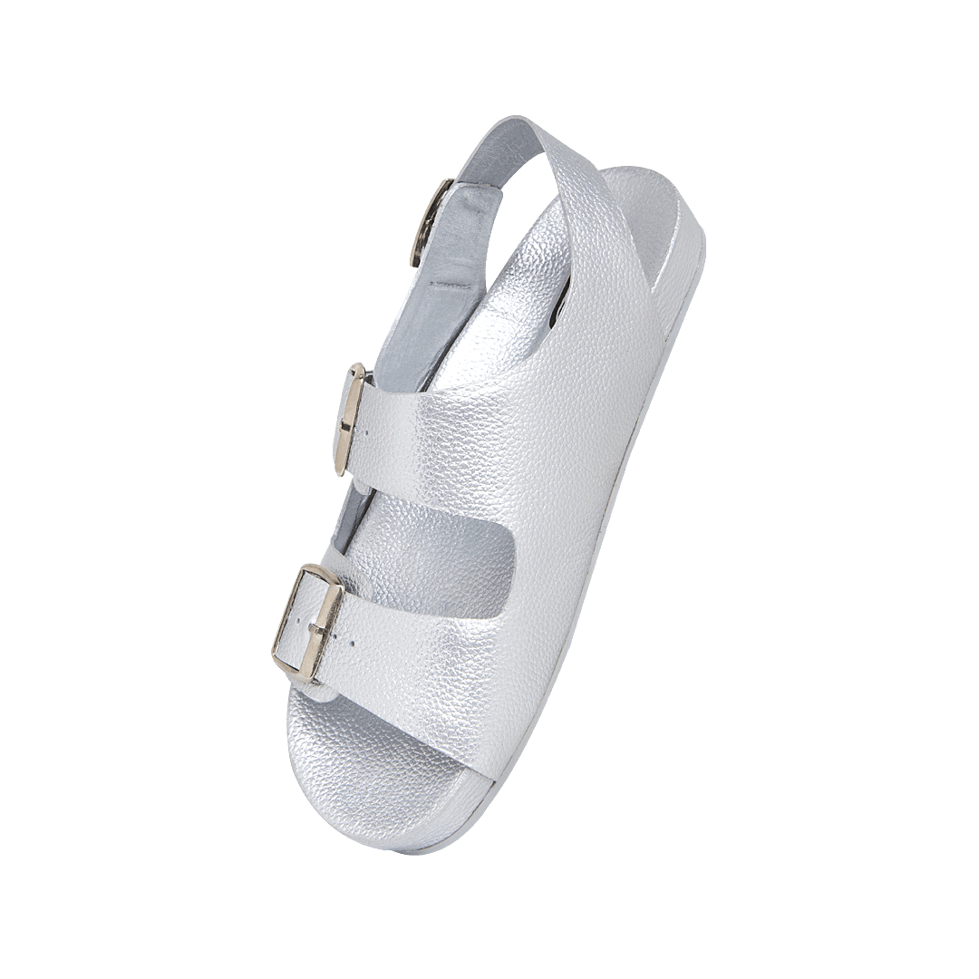 ¡Perfecta para acompañarte con estilo, todos los días! • Sandalia plana para mujer en cuero metalizado color plata • Hebillas laterales para mejor ajuste • Acabado en punta ovalada • Hecho a mano en Colombia.