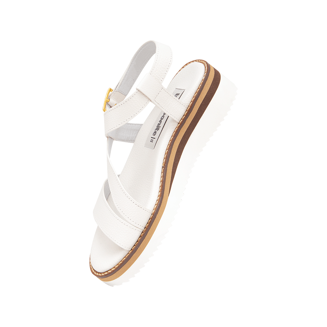 ¡Cómodas, con carácter propio! • Sandalia de plataforma para mujer en cuero granito color chantilly • Acabado en punta redonda • Hebilla lateral para mejor ajuste • Hecho a mano en Colombia.