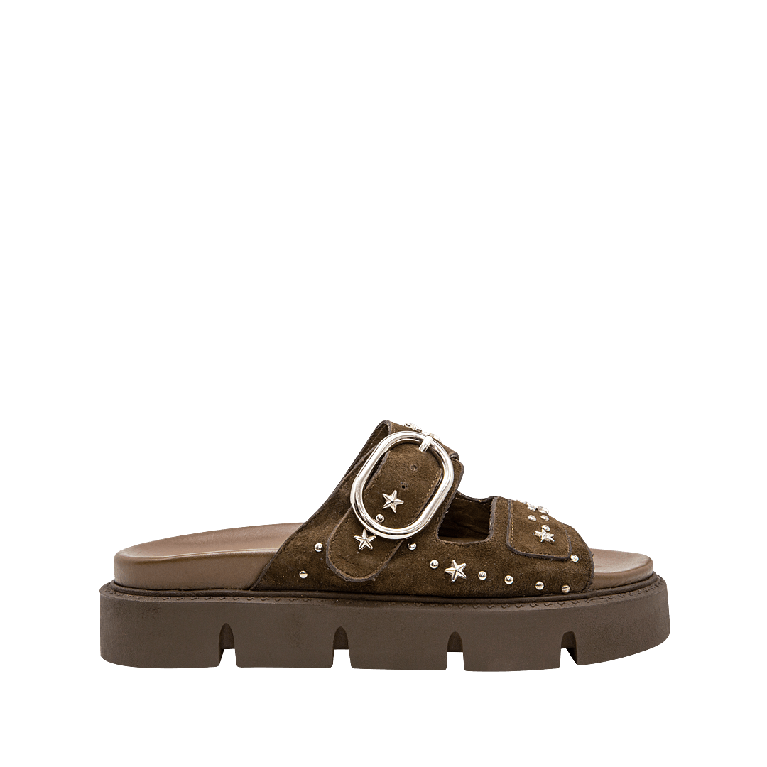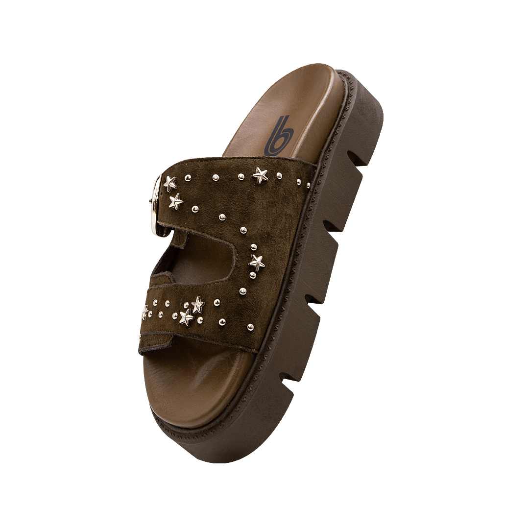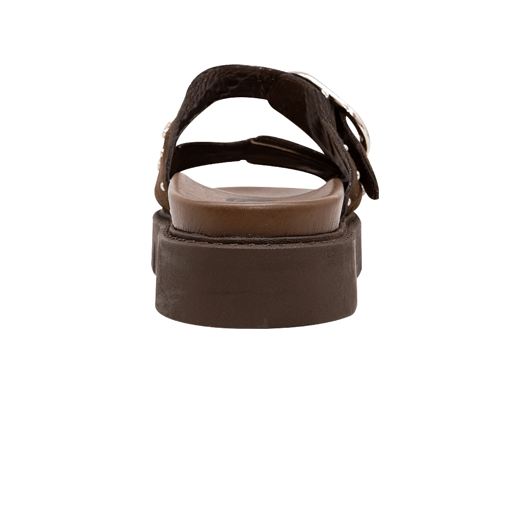 ¡Luce atractiva! • Sandalia de plataforma en cuero con taches decorativos y capellada en gamuza color chocolate • Acabado en punta semiredonda • Hebilla lateral para mejor ajuste • Plataforma dentada • Hecho a mano en Colombia.