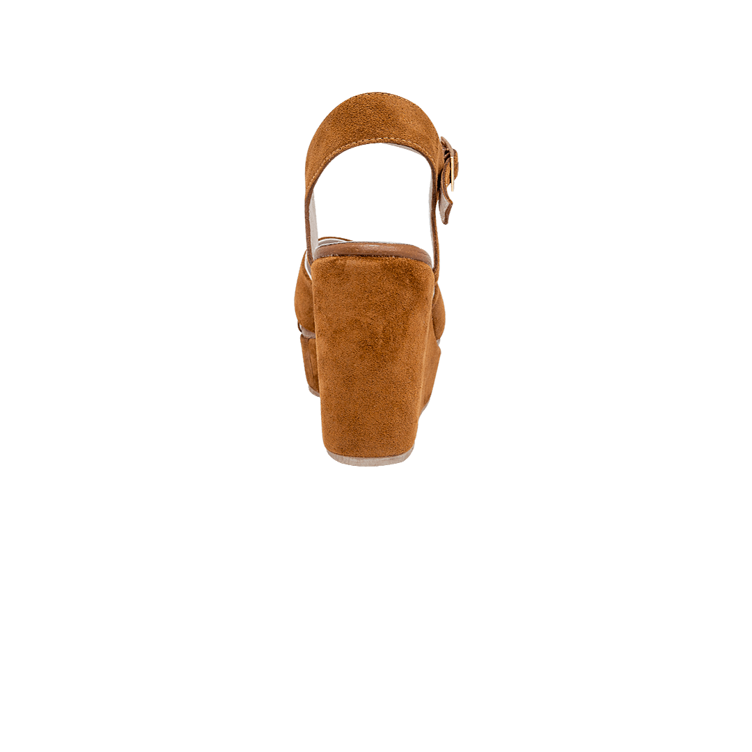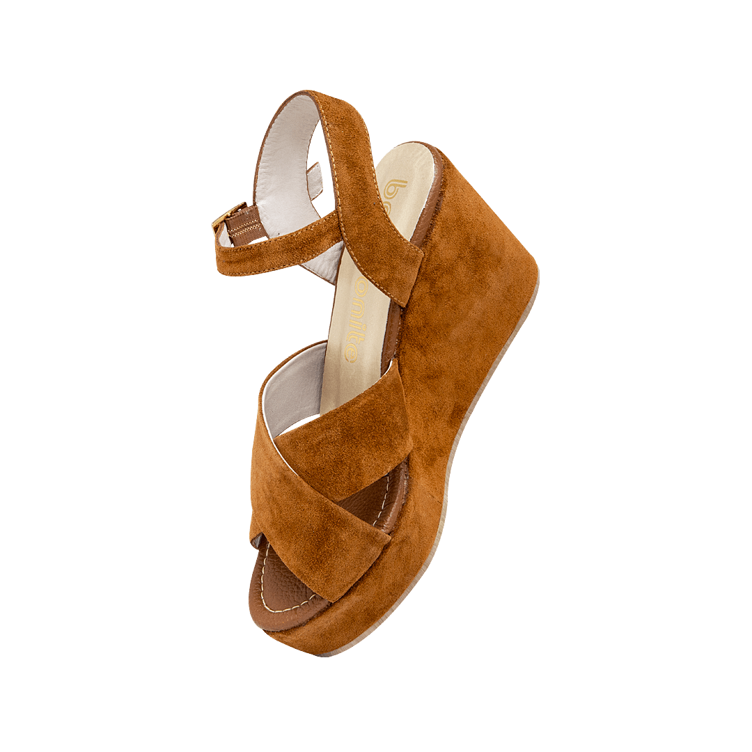 ¡Cómoda y femenina a la vez! • Sandalia de plataforma para mujer en cuero carnaza color cognac • Capellada cruzada • Acabado en punta ovalada • Hebilla lateral • Plataforma forrada en cuero • Hecho a mano en Colombia.