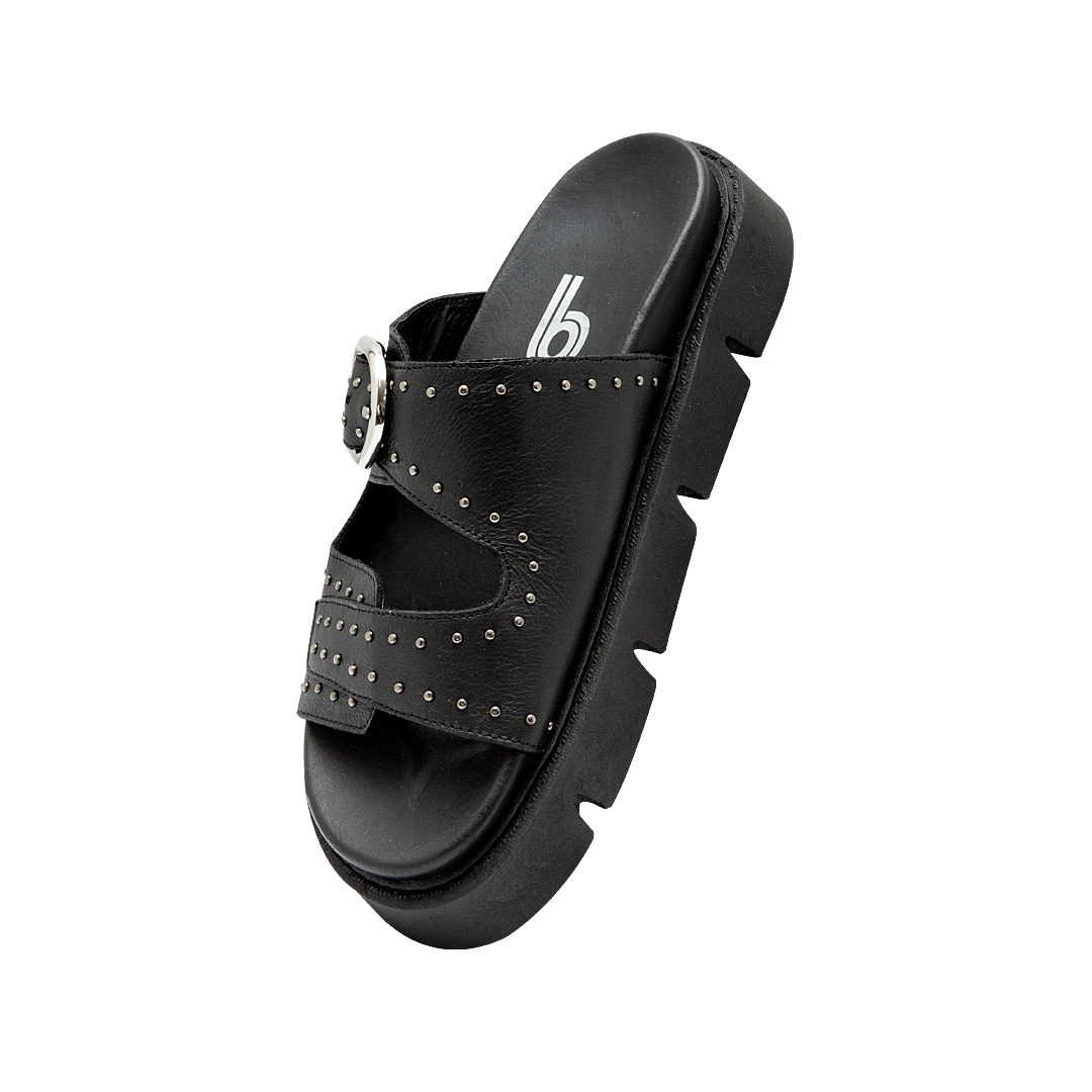 ¡Luce atractiva! • Sandalia de plataforma en cuero con taches decorativos en la capellada color negro ónix • Acabado en punta semiredonda • Hebilla lateral para mejor ajuste • Plataforma dentada • Hecho a mano en Colombia.