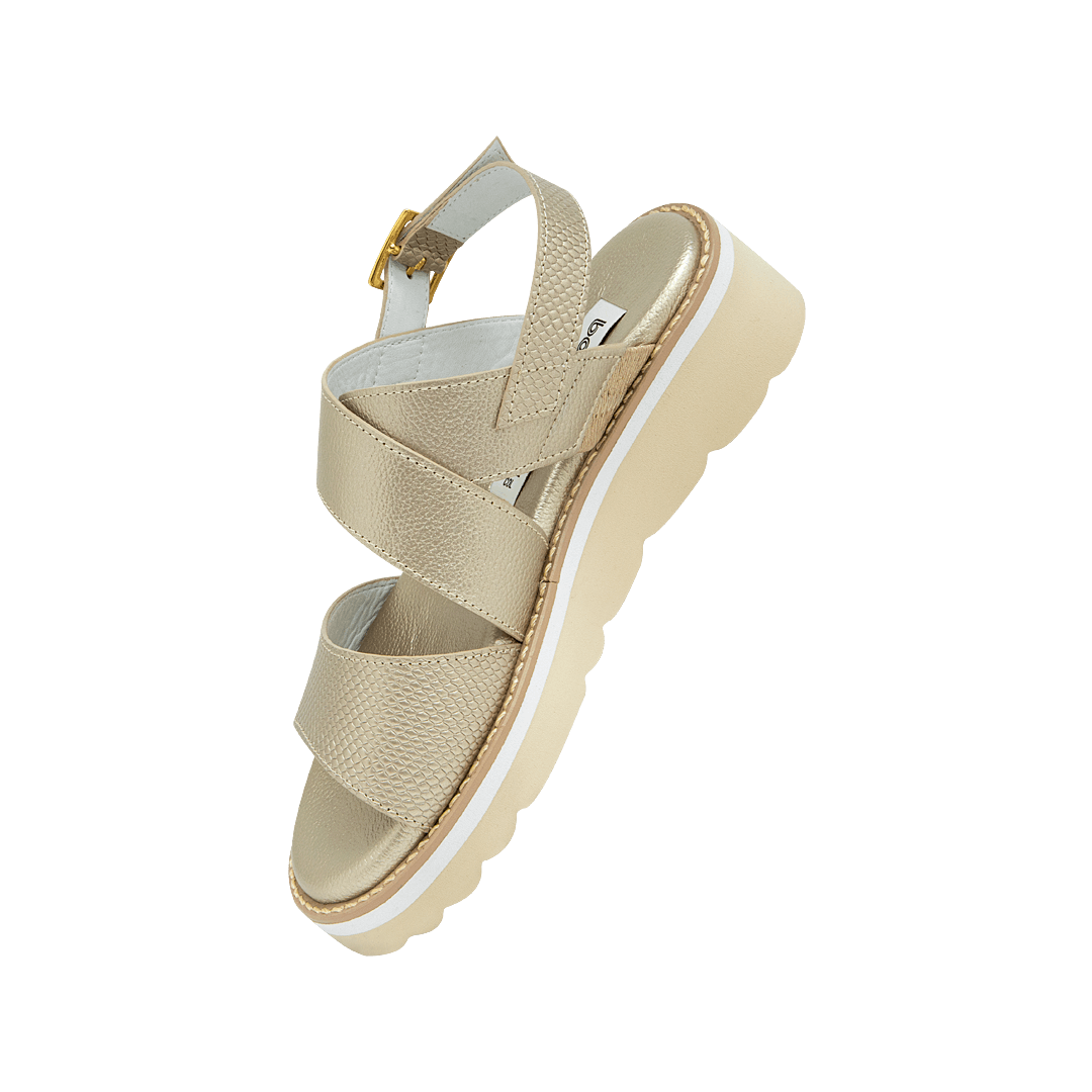 ¡Comodidad y estilo! • Sandalia de plataforma para mujer en cuero grabado y granito color metal arena • Acabado en punta redonda • hebilla lateral para mejor ajuste • Hecho a mano en Colombia.