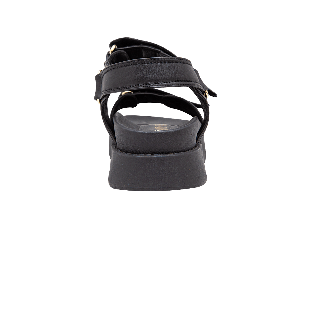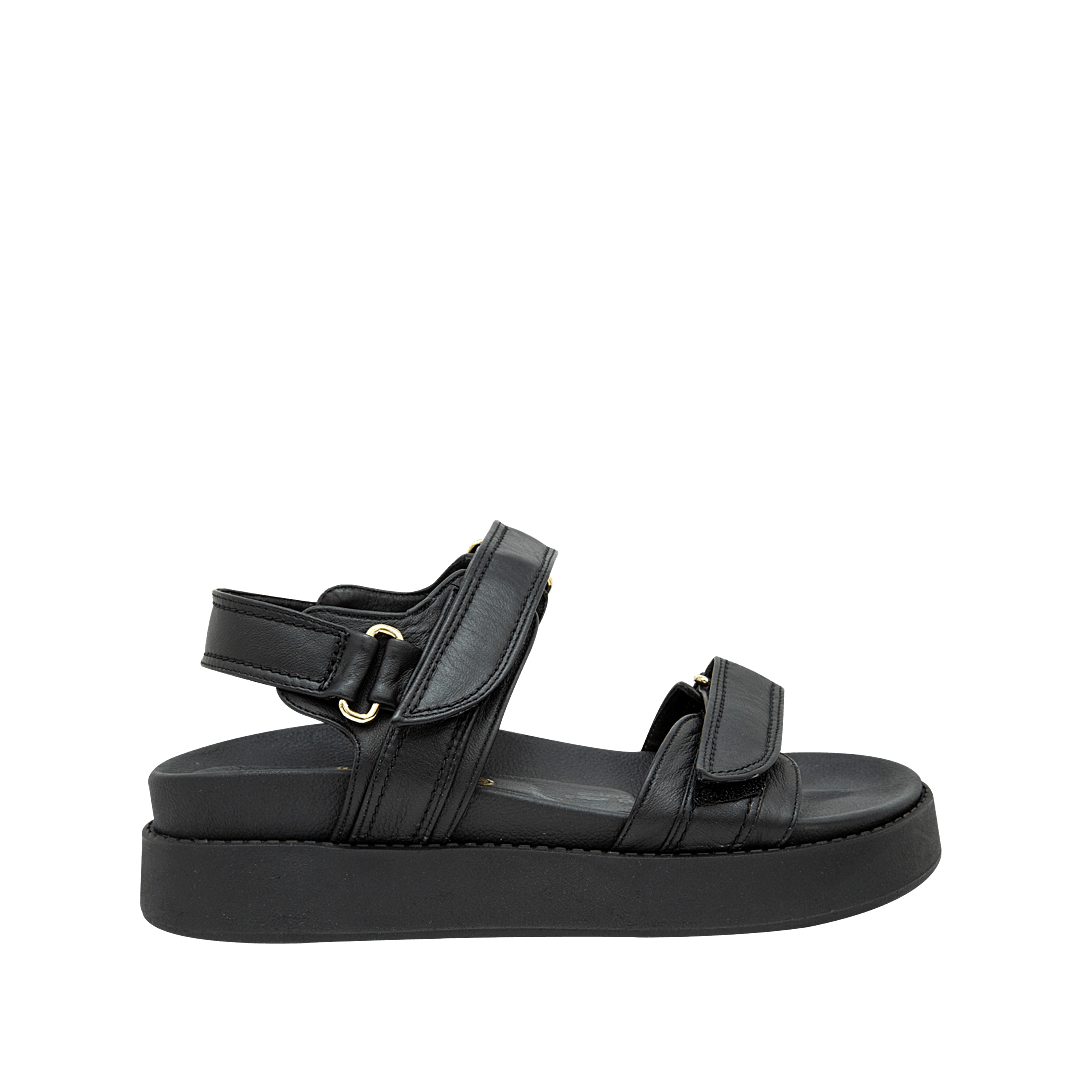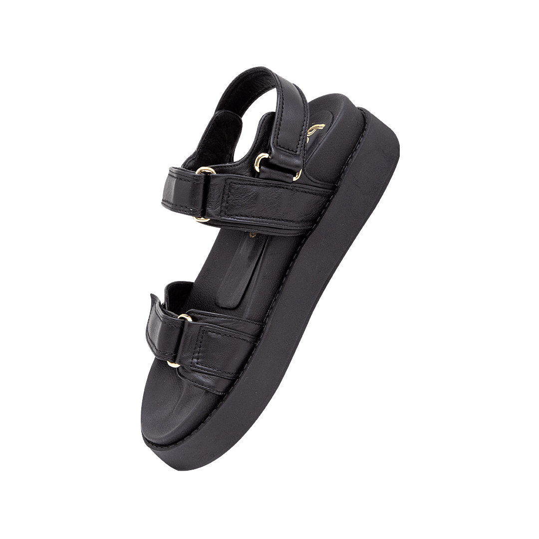 ¡Perfectas para un look relajado y moderno! • Sandalia de plataforma para mujer en cuero confección negro ónix • Doble amarre en velcro para mejor ajuste • Acabado en punta ovalada • Hecho a mano en Colombia.