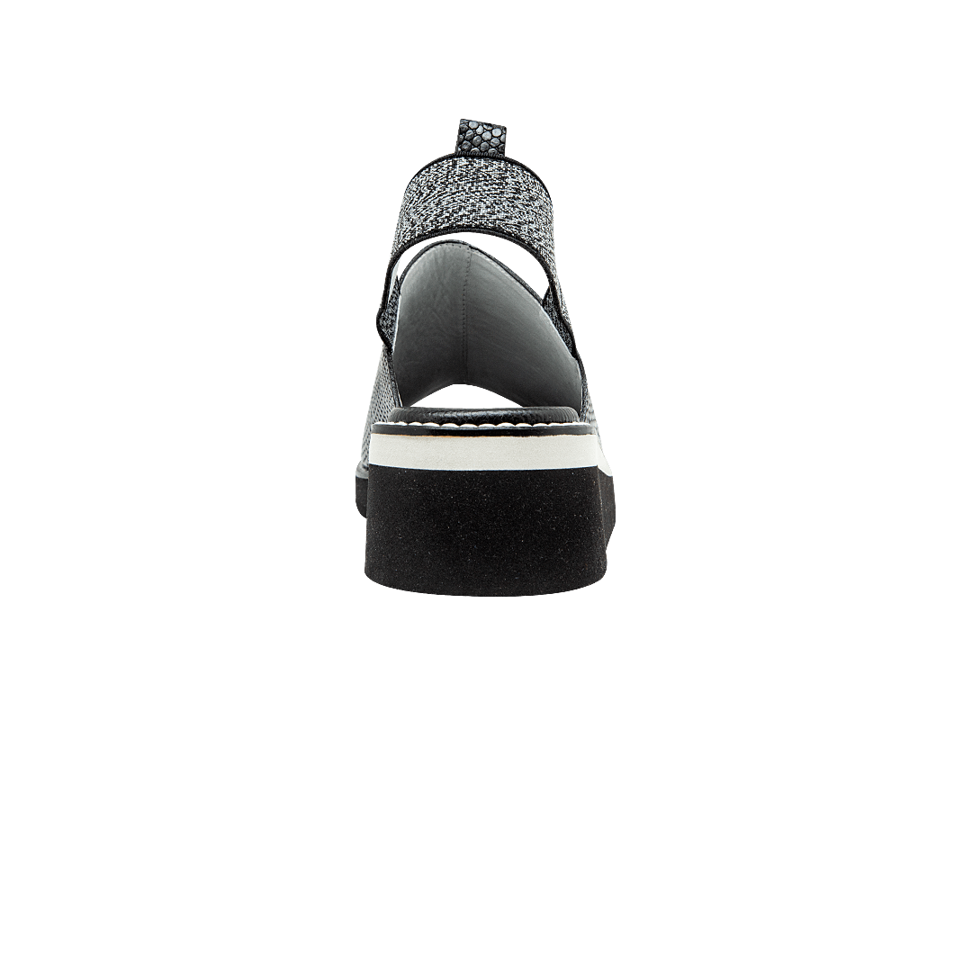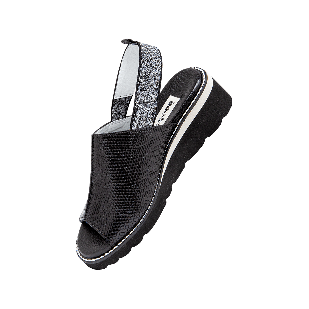 ¡Comodidad y encanto! • Sandalia de plataforma para mujer en cuero grabado color negro ónix • Acabado en punta ovalada • Tira trasera con mini resorte lateral para mejor ajuste • Hecho a mano en Colombia.