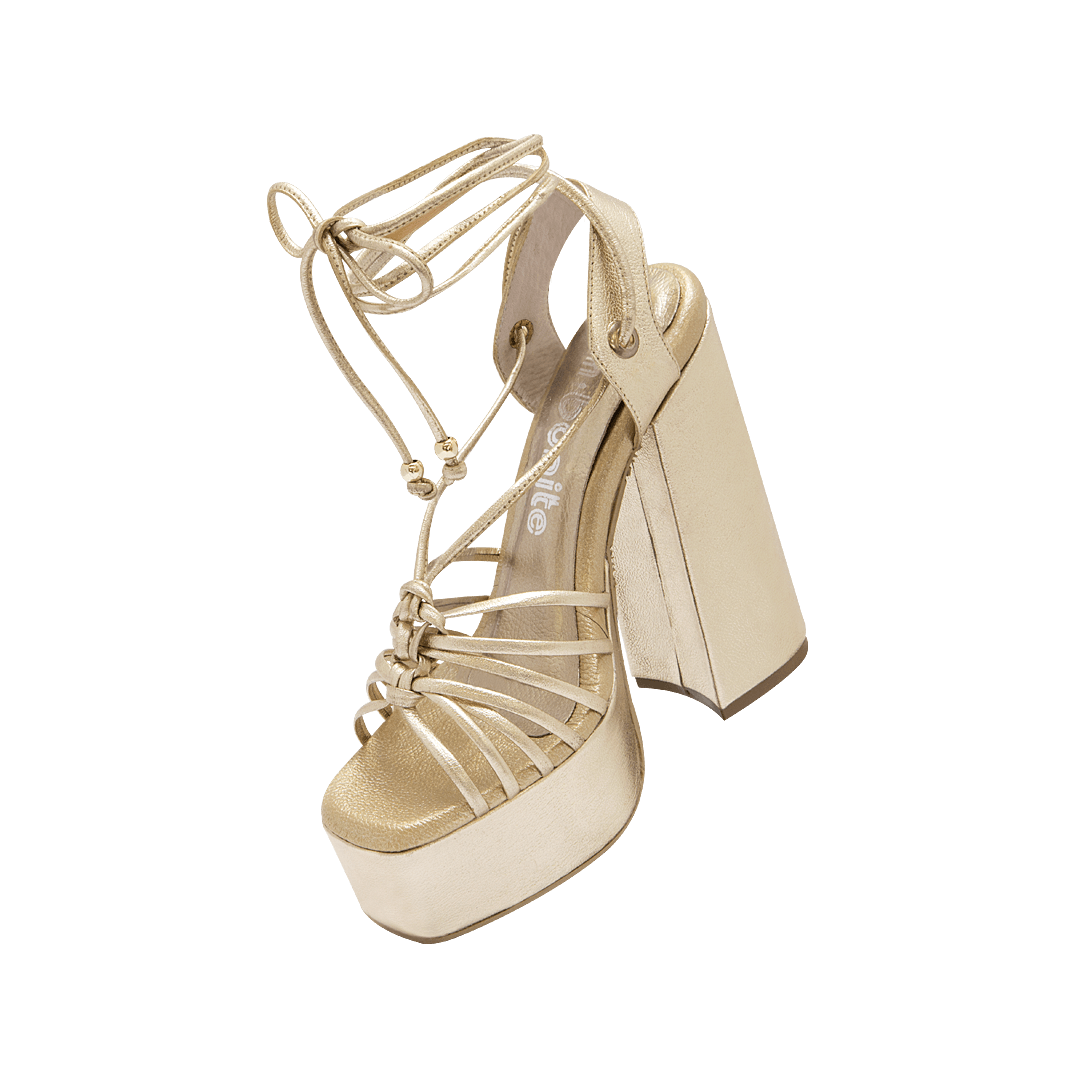 ¡Eleva tu estilo! • Sandalia de plataforma en cuero color oro • Capellada en tiras • Acabado en punta cuadrada • Amarre al tobillo con cordones en cuero • Talón descubierto • Tacón forrado en cuero de 13 cm • Suela en caucho • Hecho a mano en Colombia.