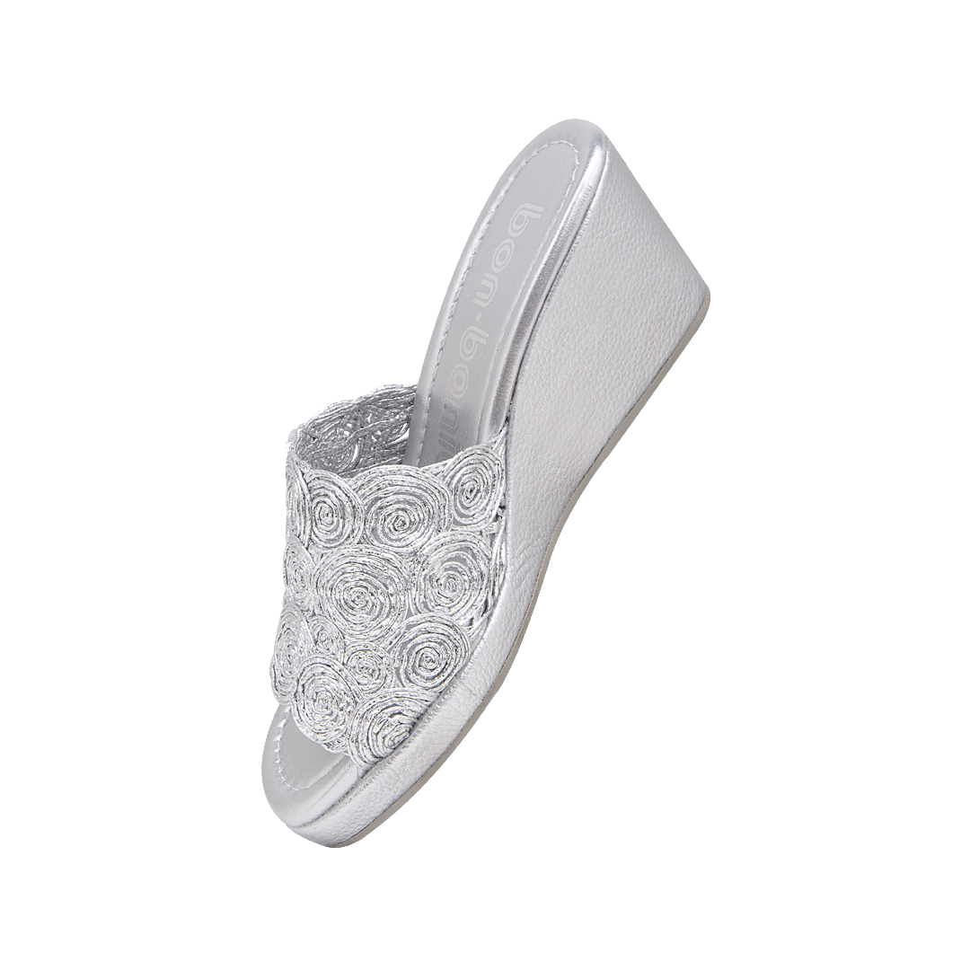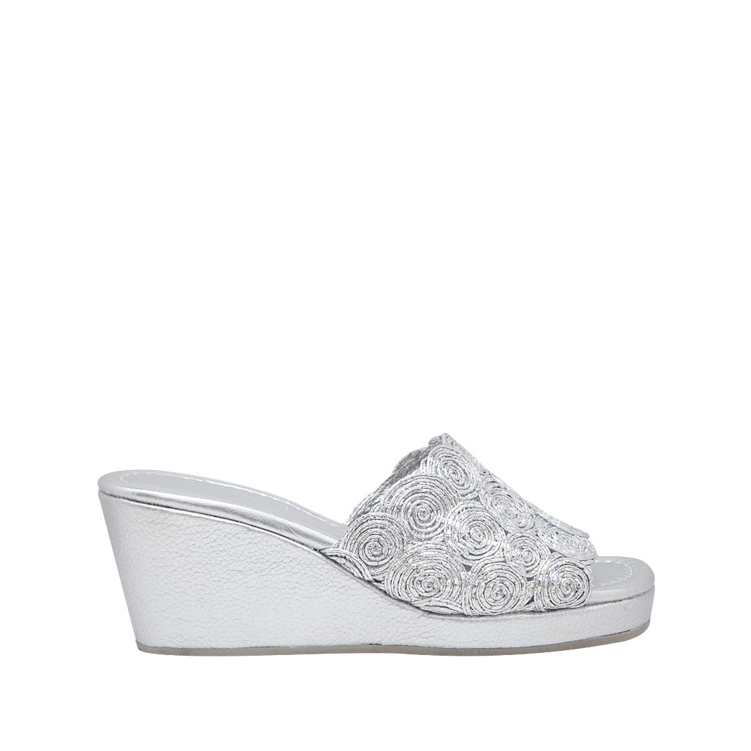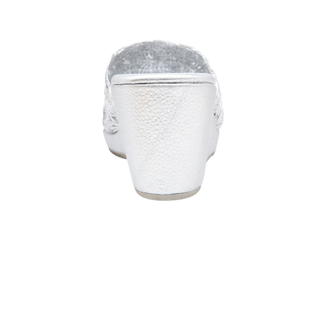 ¡Comodidad con intención! • Sandalia de plataforma para mujer tipo mule color plata • Acabado en punta semi cuadrada • Plataforma forrada en cuero metalizado • Hecho a mano en Colombia.