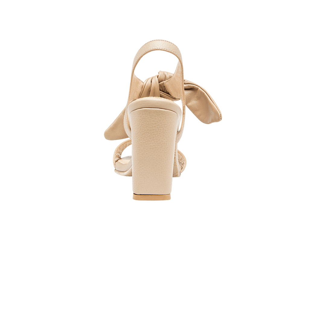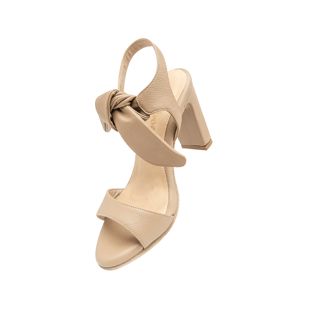 ¡Camina con estilo! • Sandalia de tacón para mujer en cuero color capuccino • Capellada con moño decorativo en cuero • Acabado en punta ovalada • Tacón geométrico forrado en cuero • Hecho a mano en Colombia.