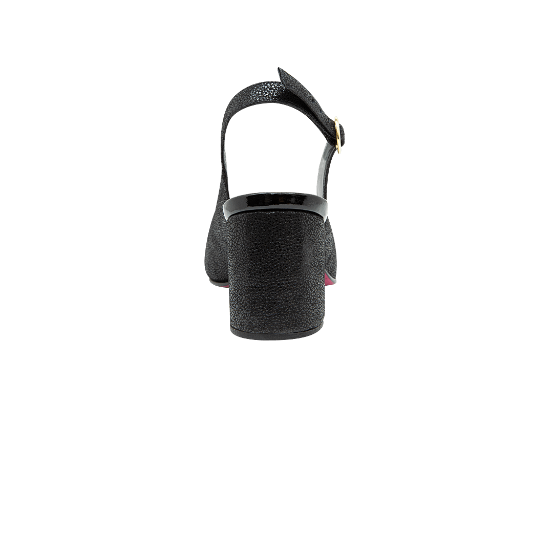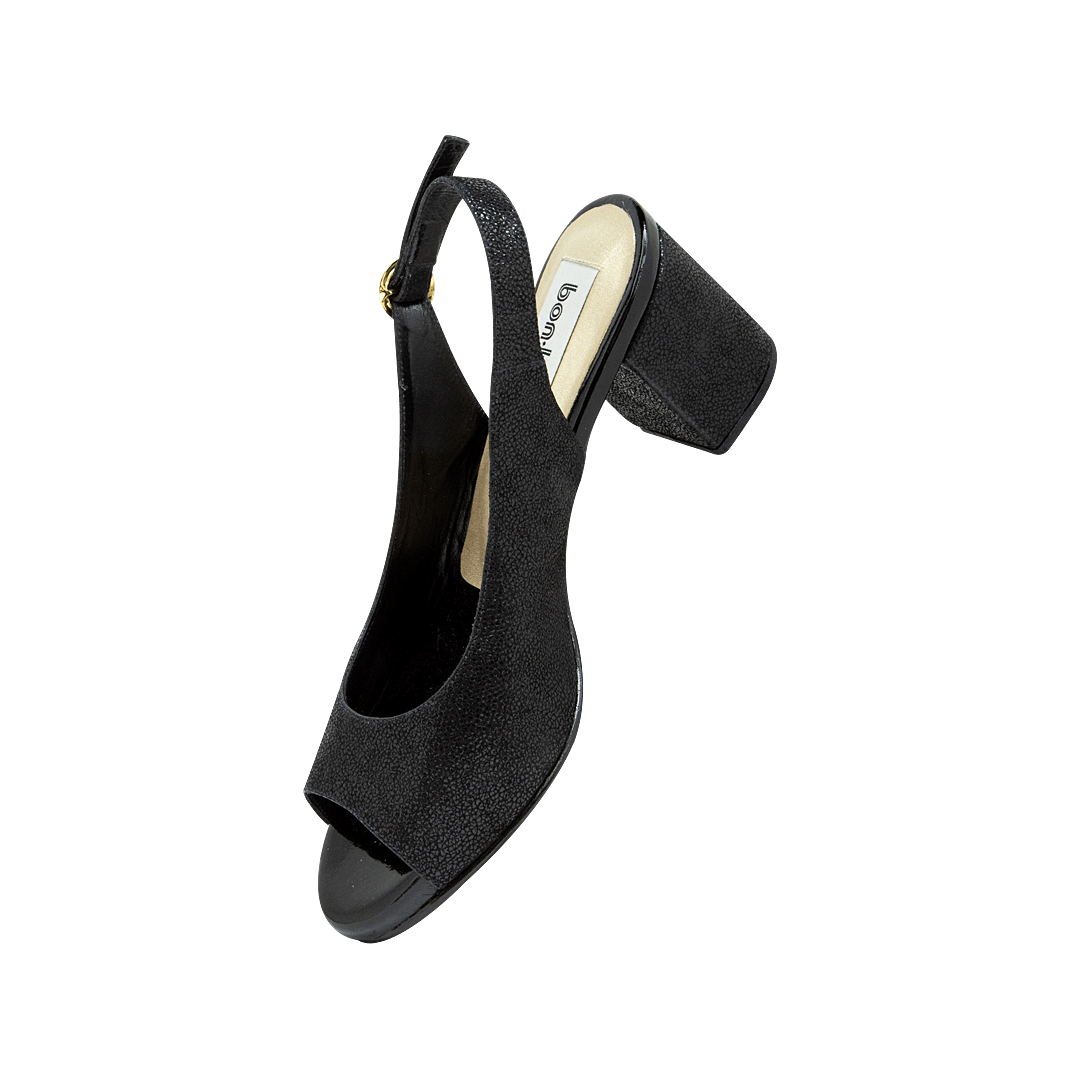 ¡Aporta frescura y elegancia a cualquier look! • Sandalia de tacón para mujer en cuero brillante color negro ónix • Acabado en punta ovalada • Hebilla lateral para mejor ajuste • Talón descubierto • Tacón forrado en cuero • Hecho a mano en Colombia.