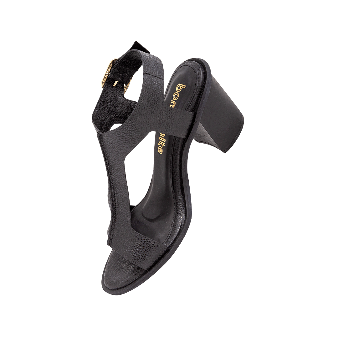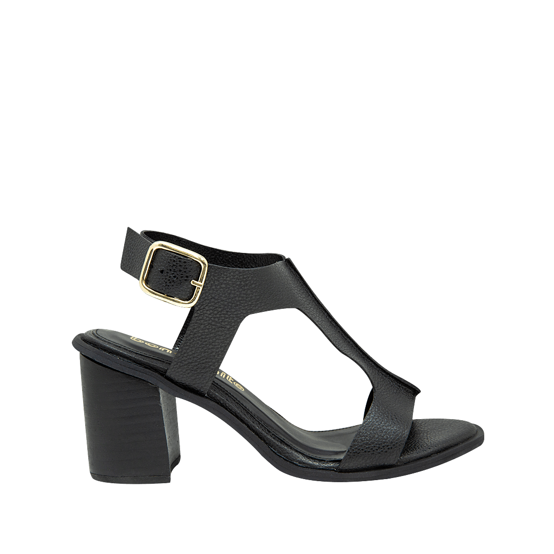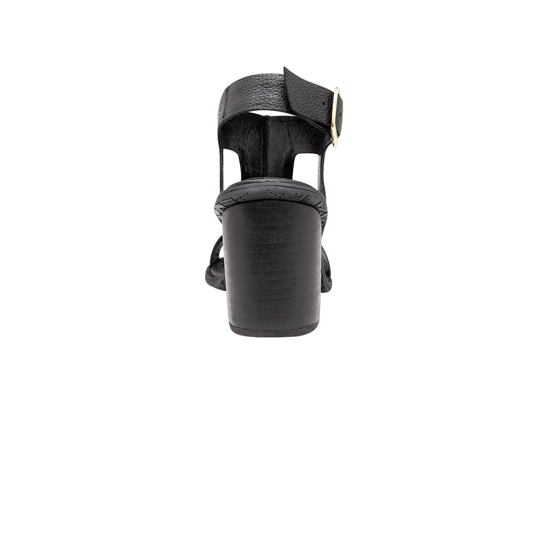 ¡Estiliza el paso con sutileza! • Sandalia de tacón para mujer en cuero granito color negro ónix • Acabado en punta ovalada • Escotes y hebilla lateral para mejor ajuste • Talón descubierto • Tacón forrado en madera • Hecho a mano en Colombia.