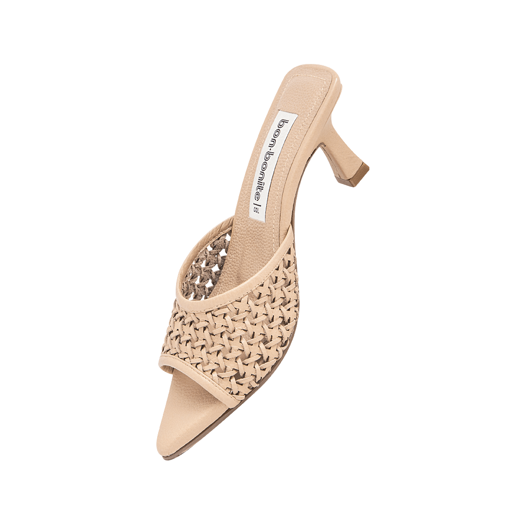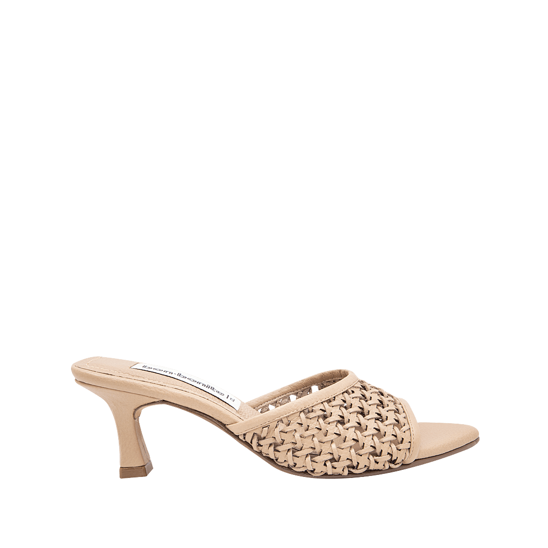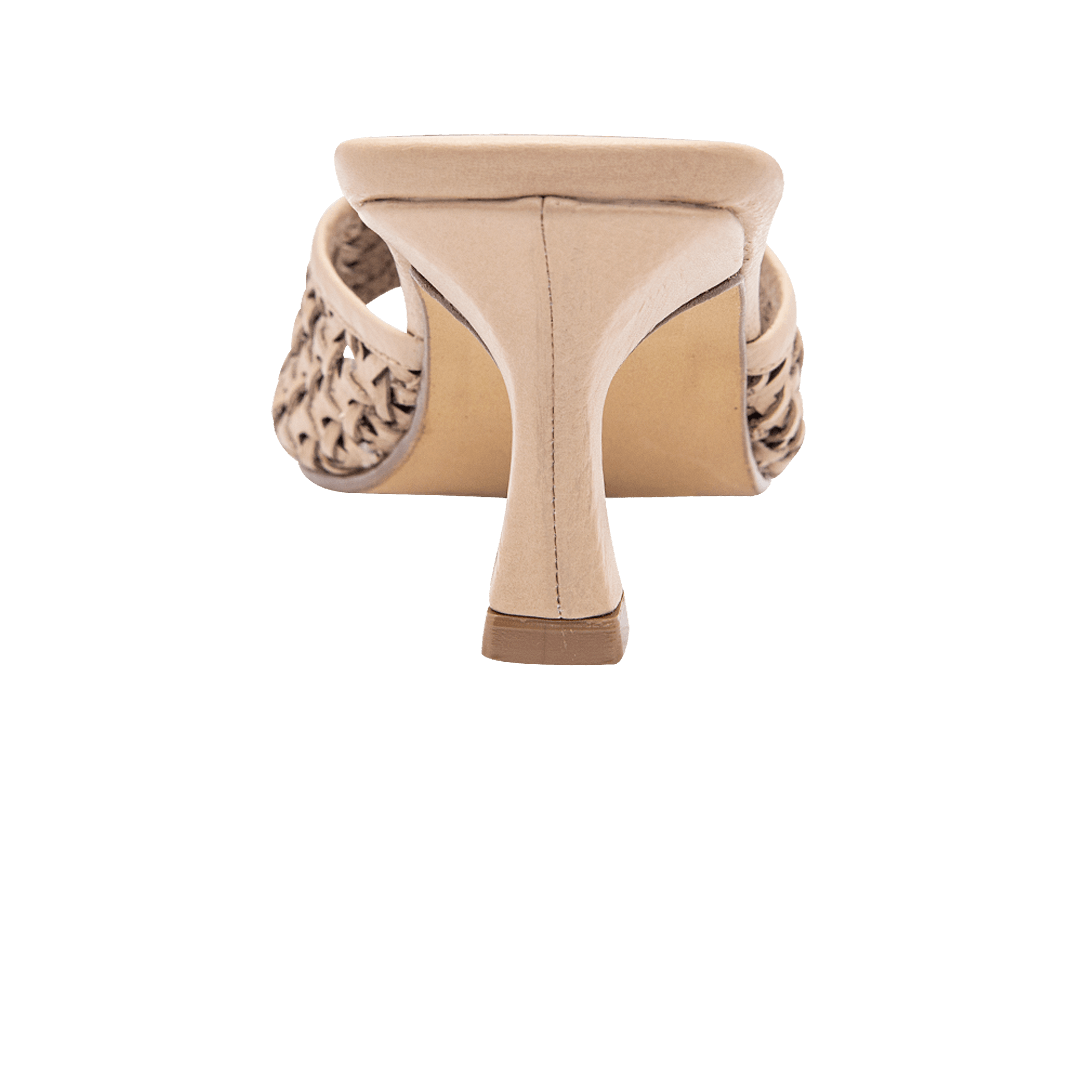 ¡La elegancia también puede ser moderna! • Sandalia de tacón para mujer tipo mule en cuero tejido a mano color capuccino • Acabado en punta • Tacón forrado en cuero • Hecho a mano en Colombia.