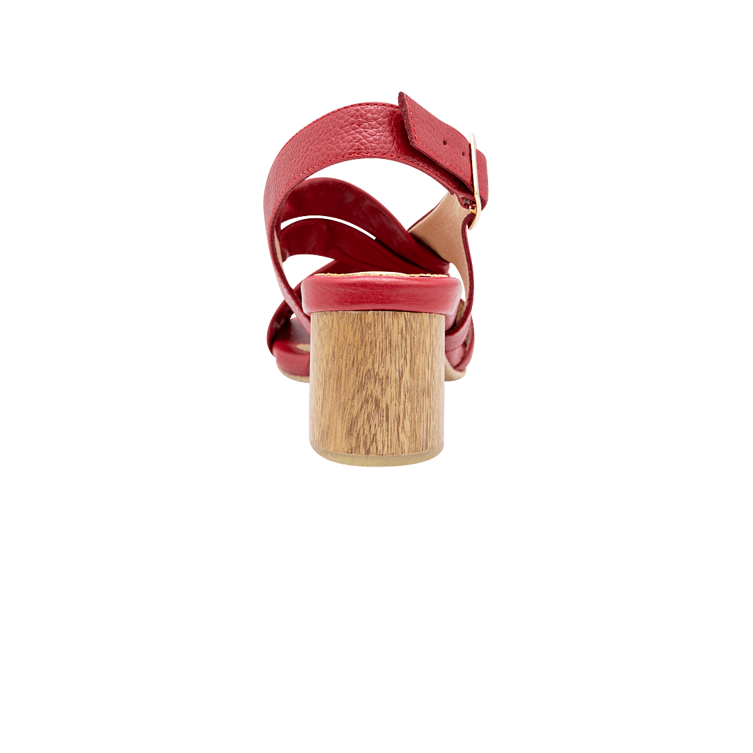 ¡Pensadas para caminar con fuerza y propósito! • Sandalia de tacón para mujer en cuero confección color rojo escarlata • Acabado en punta cuadrada • Capellada en cuero entrelazado con escote lateral • Hebilla lateral para mejor ajuste • Talón descubierto • Tacón forrado en madera • Hecho a mano en Colombia.