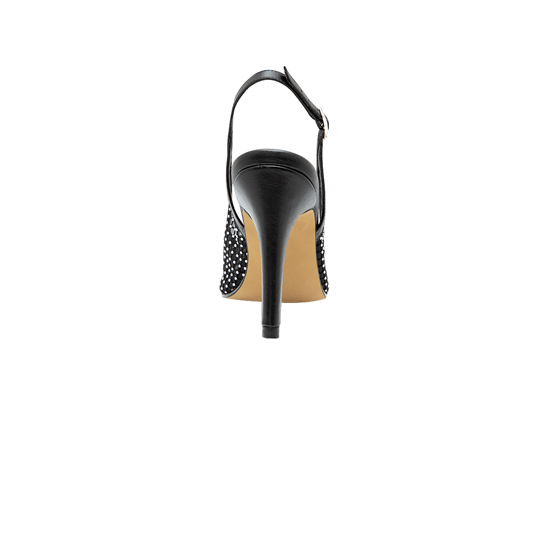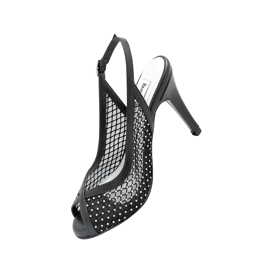 ¡Irradia feminidad! • Sandalia de tacón en textil color negro ónix • Capellada en malla con piedras de fantasía y vivo en cuero • Acabado en punta ovalada • Hebilla lateral • Tacón aguja forrado en cuero • Hecho a mano en Colombia.