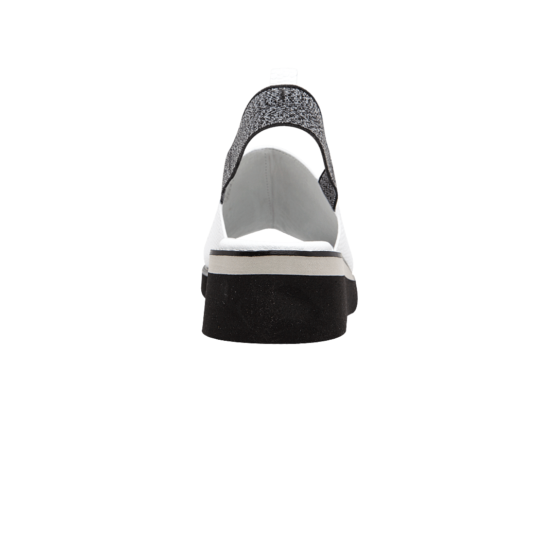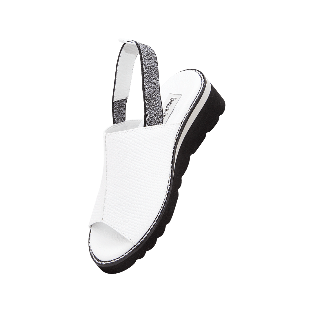 ¡Comodidad y estilo! • Sandalia de plataforma para mujer en cuero grabado color blanco puro • Acabado en punta ovalada • Tira trasera con resorte para mejor ajuste • Hecho a mano en Colombia.