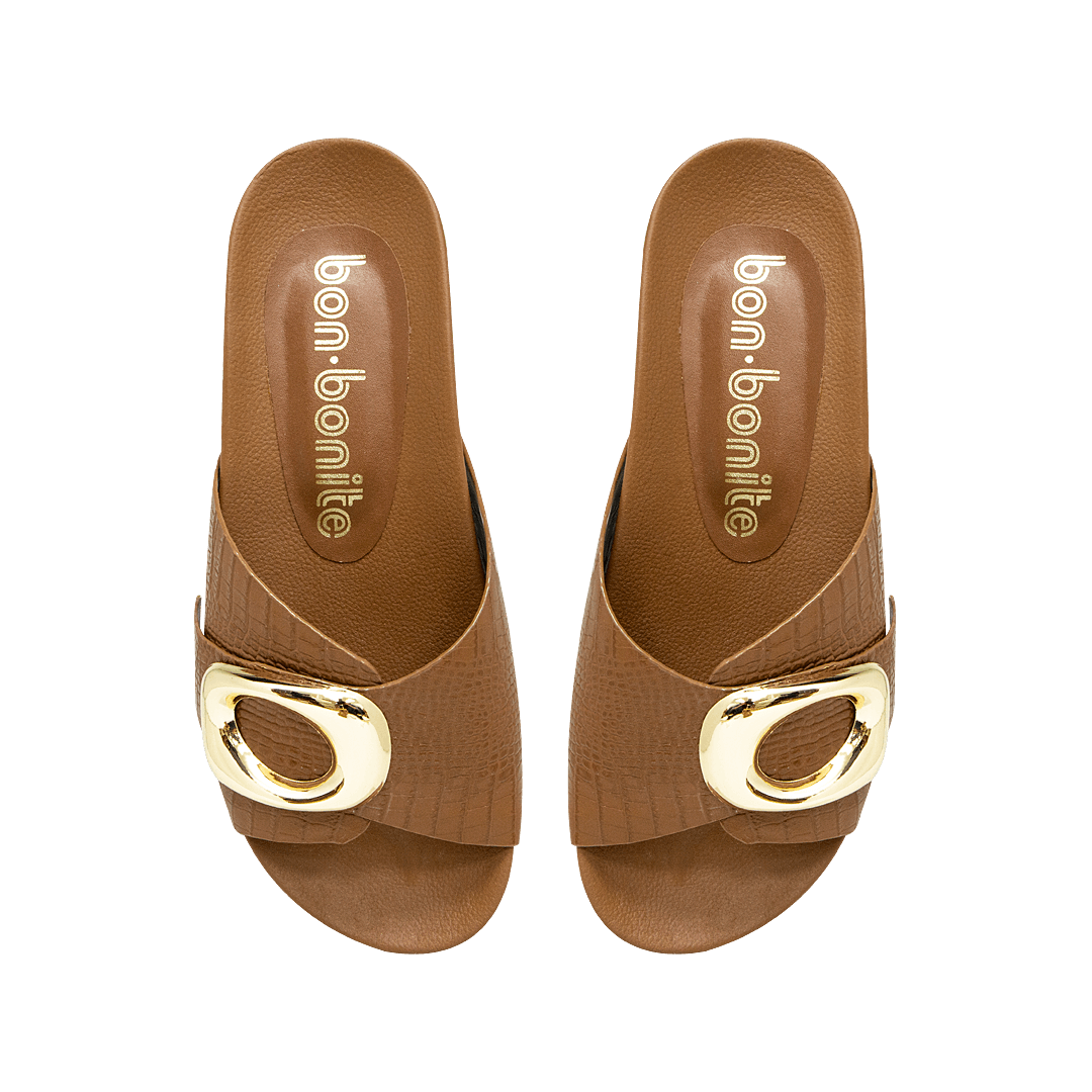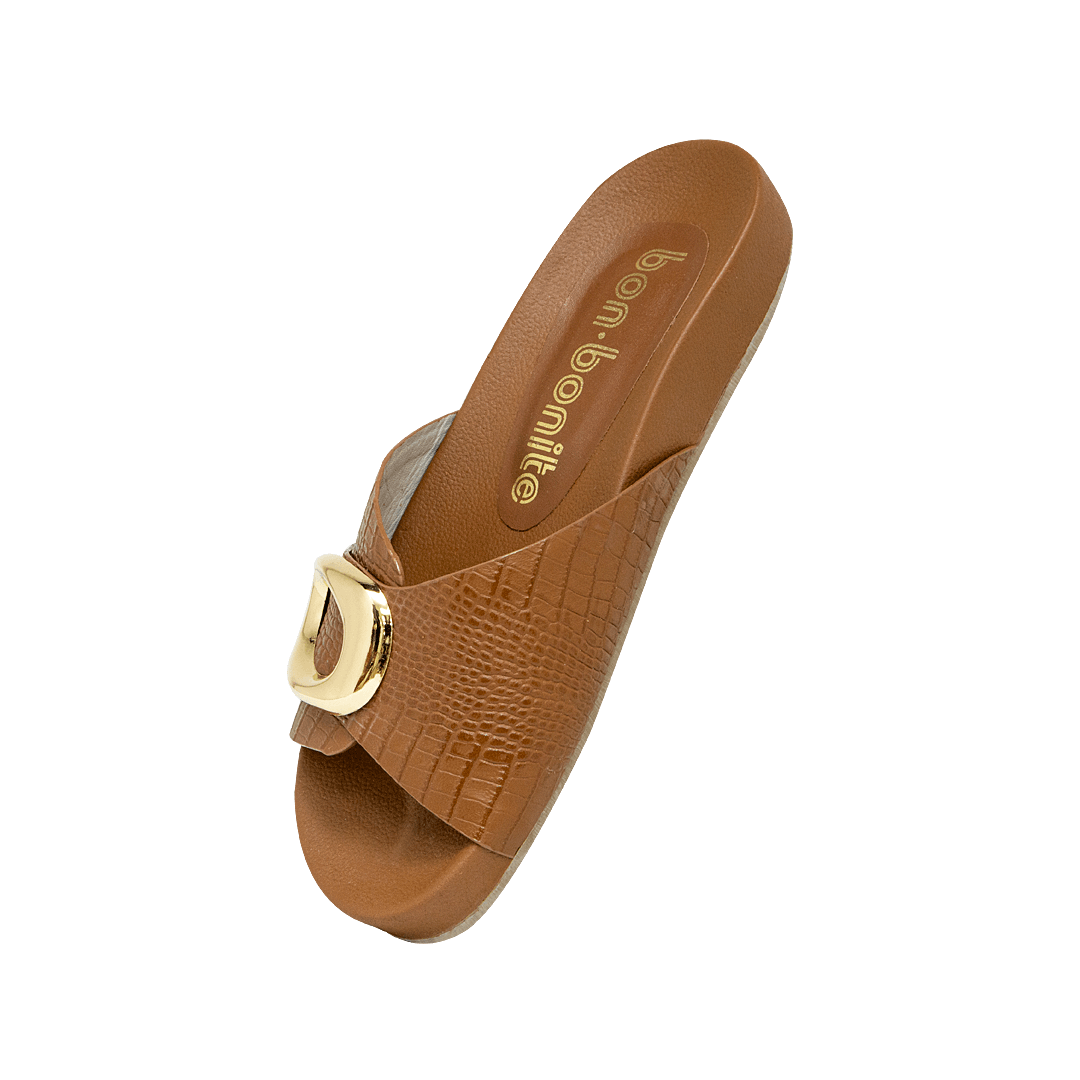 ¡La base perfecta para tus looks boho chic! • Sandalia plana para mujer en cuero grabado color roble • Herraje en la capellada • Acabado en punta ovalada • Hecho a mano en Colombia.