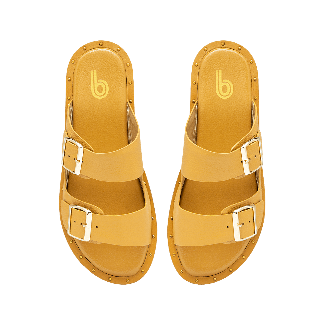 ¡Combinación de estilo urbano y comodidad! • Sandalia plana para mujer en cuero granito color mostaza • Taches decorativos • Acabado en punta ovalada • Hebillas laterales • Plataforma liviana dentada • Hecho a mano en Colombia.