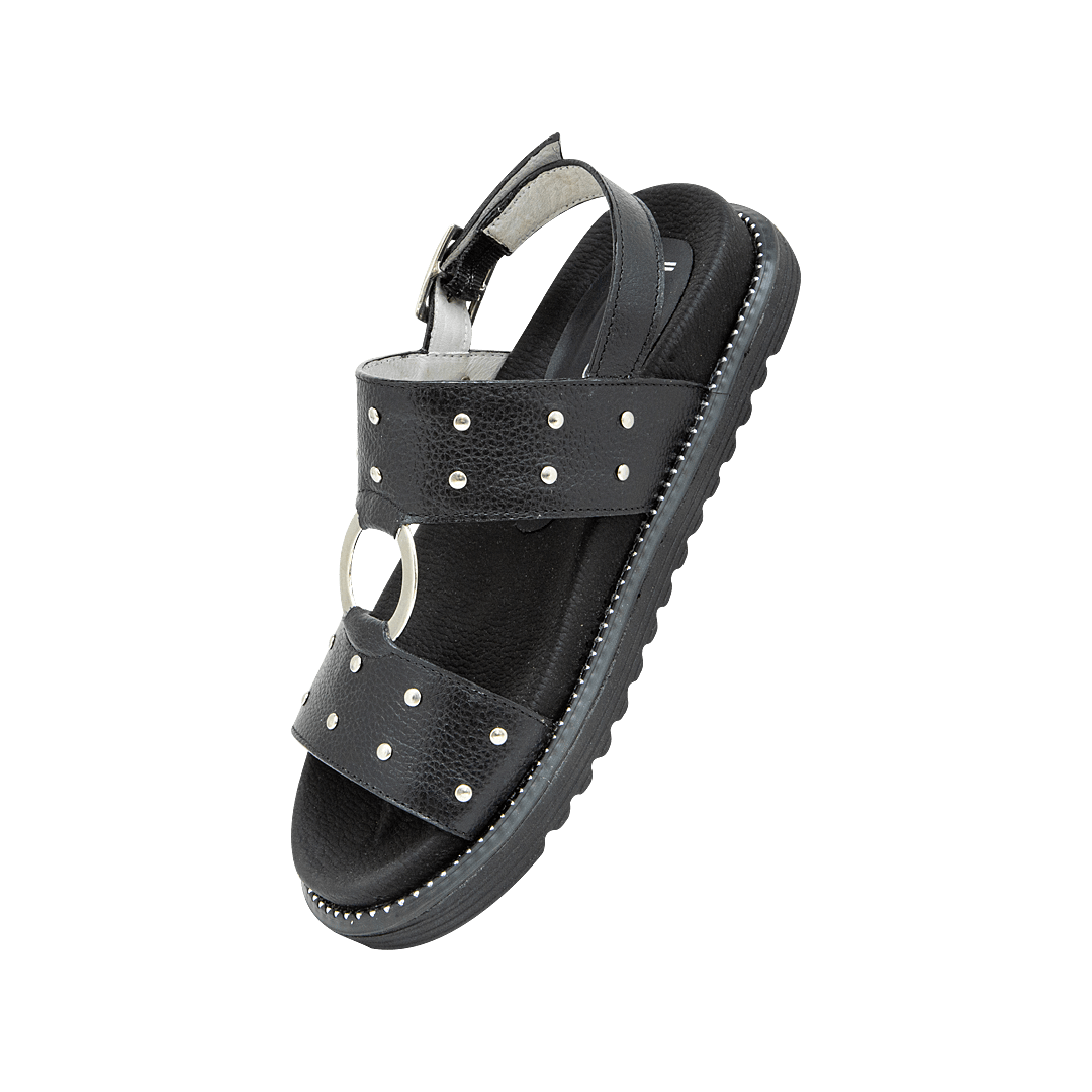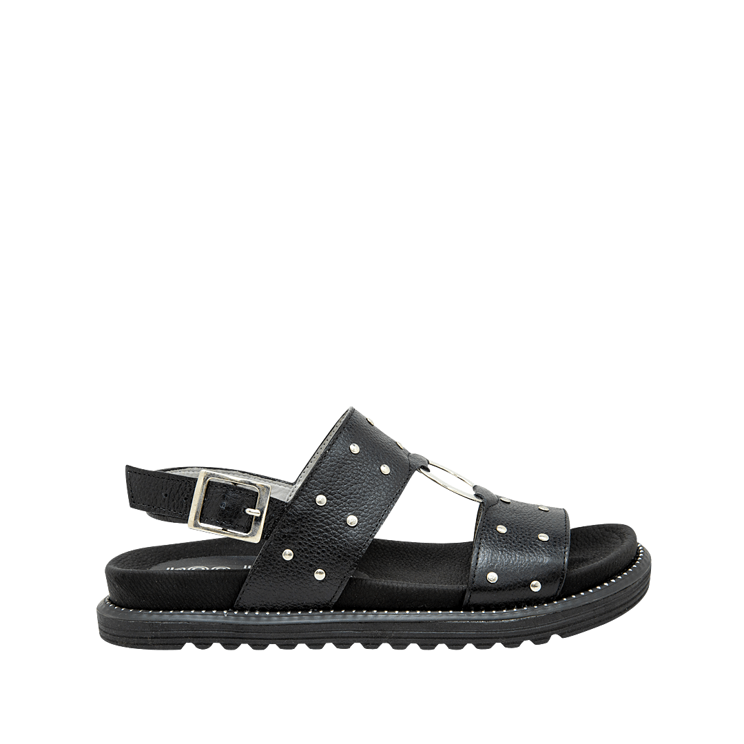 ¡Energía, frescura y personalidad! • Sandalia plana con taches para mujer en cuero granito color negro ónix • Acabado en punta ovalada • Aplique frontal decorativo • Hebilla lateral para mejor ajuste • Hecho a mano en Colombia.