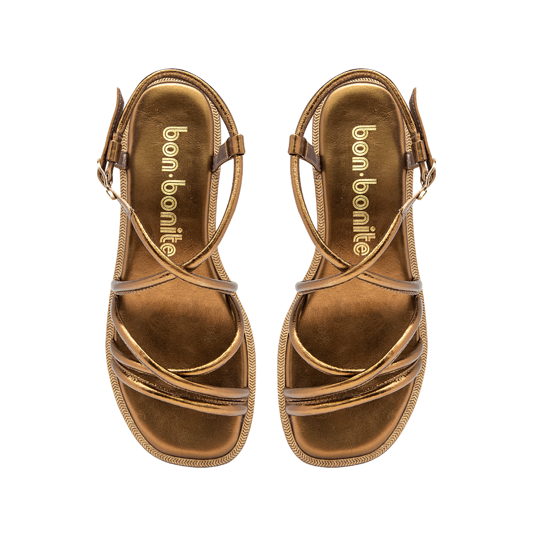 ¡Sofisticada y cómoda! • Sandalia plana para mujer en cuero metalizado color bronce • Acabado en punta cuadrada • Tiras en cuero para un acabado tipo romano • Mini tacón forrado en cuero • Hecho a mano en Colombia.