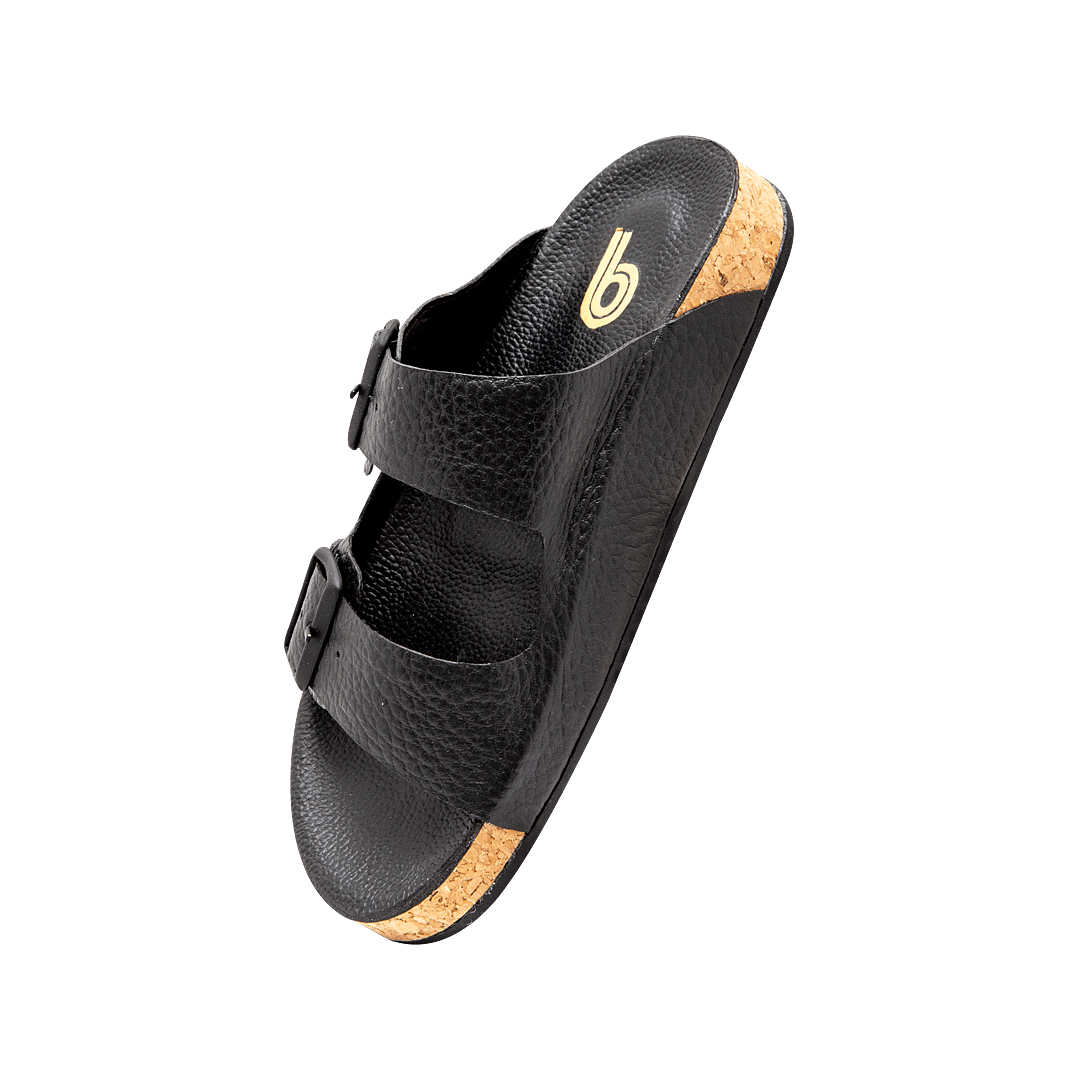 ¡La opción perfecta para un look casual! • Sandalia plana con hebillas en cuero granito color negro ónix • Acabado en punta semi redonda • Plataforma forrada en corcho natural • Hecho a mano en Colombia.