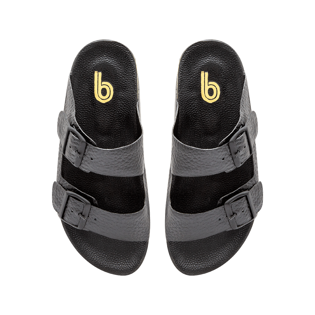 Sandalia plana con hebillas en cuero negro ónix