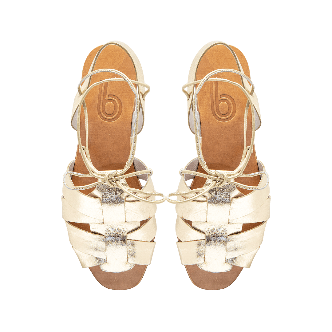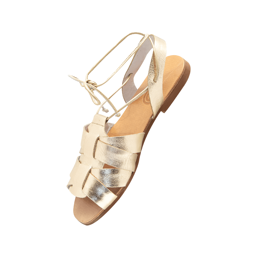 ¡Diseño minimalista que refleja tu estilo único! • Sandalia plana para mujer en cuero metalizado color oro italiano • Acabado en punta almendrada • Tiras en cuero para un acabado tipo romano • Mini tacón en caucho • Hecho a mano en Colombia.