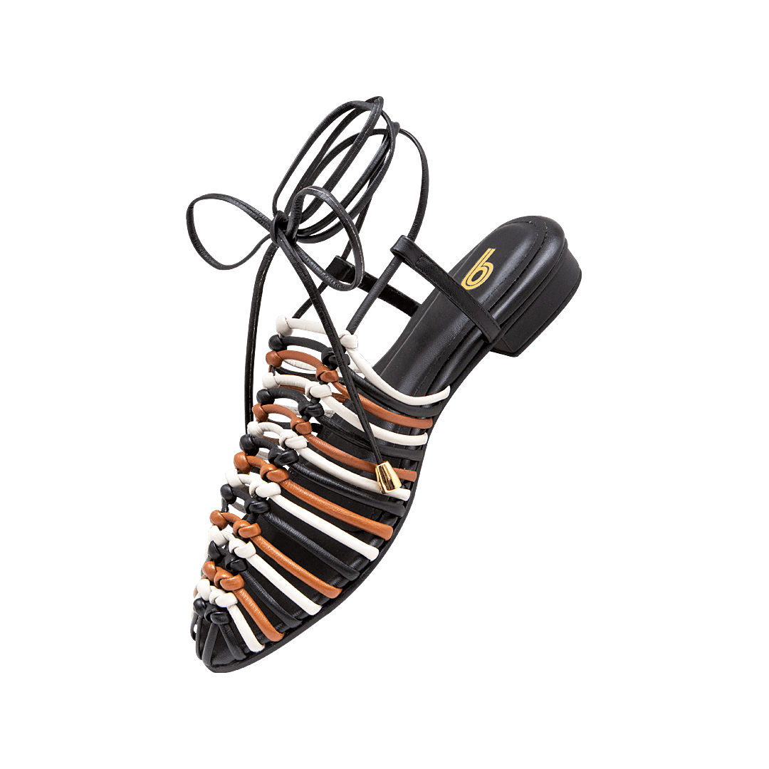 ¡Poderosa y cómoda! • Sandalia plana en cuero confección color negro ónix por miel y duna • Acabado en punta • Tiras en cuero para un acabado tipo romano • Mini tacón en cuero • Hecho a mano en Colombia.