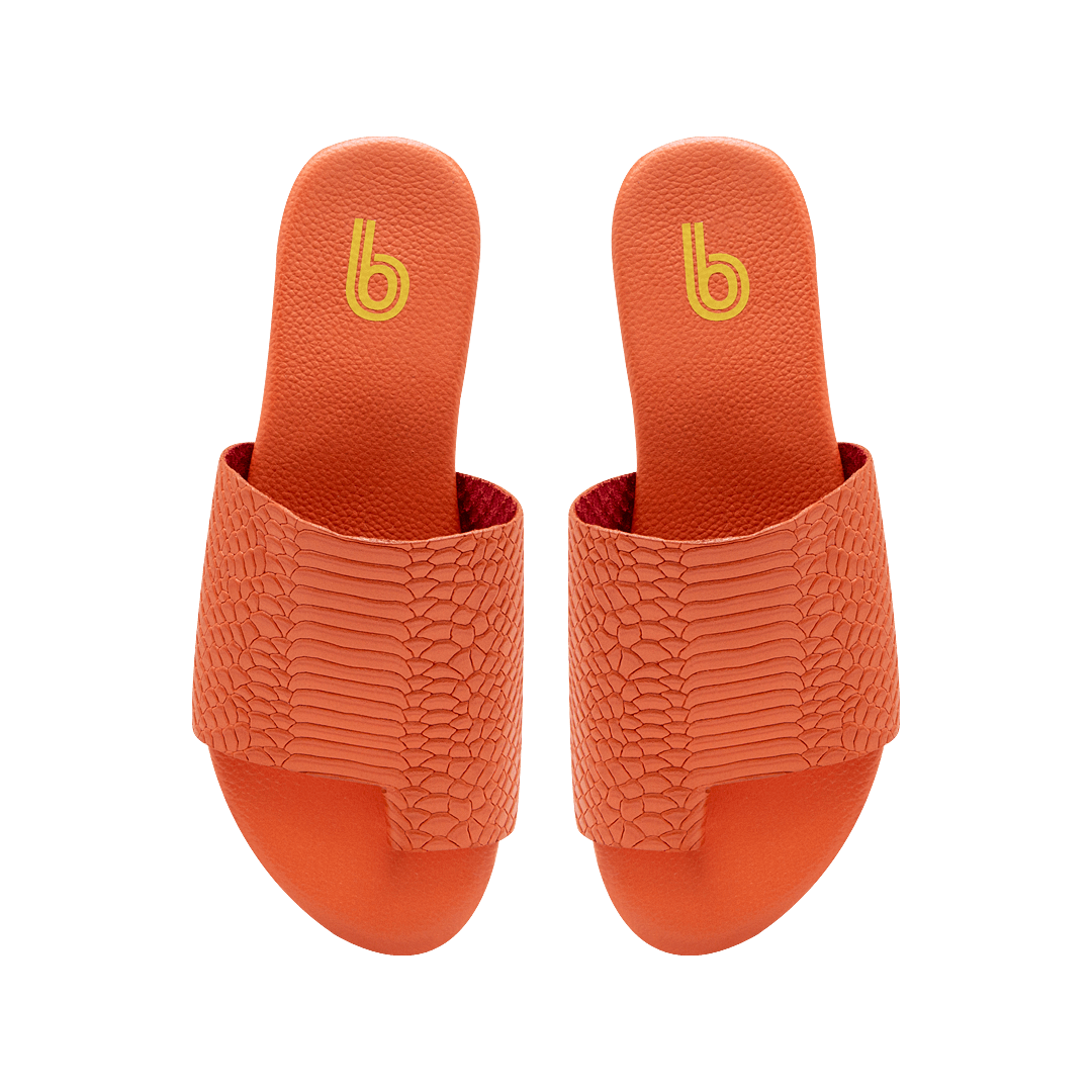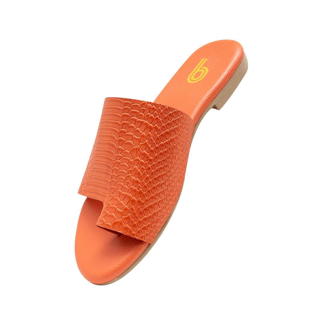 ¡Cómoda y relajada! • Sandalia plana estilo tres puntadas para mujer en cuero grabado color papaya • Acabado en punta ovalada • Talón descubierto • Hecho a mano en Colombia.