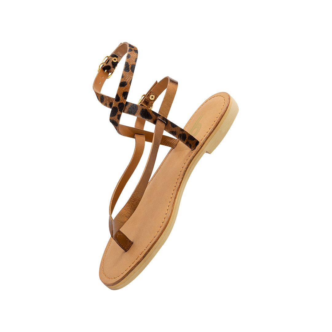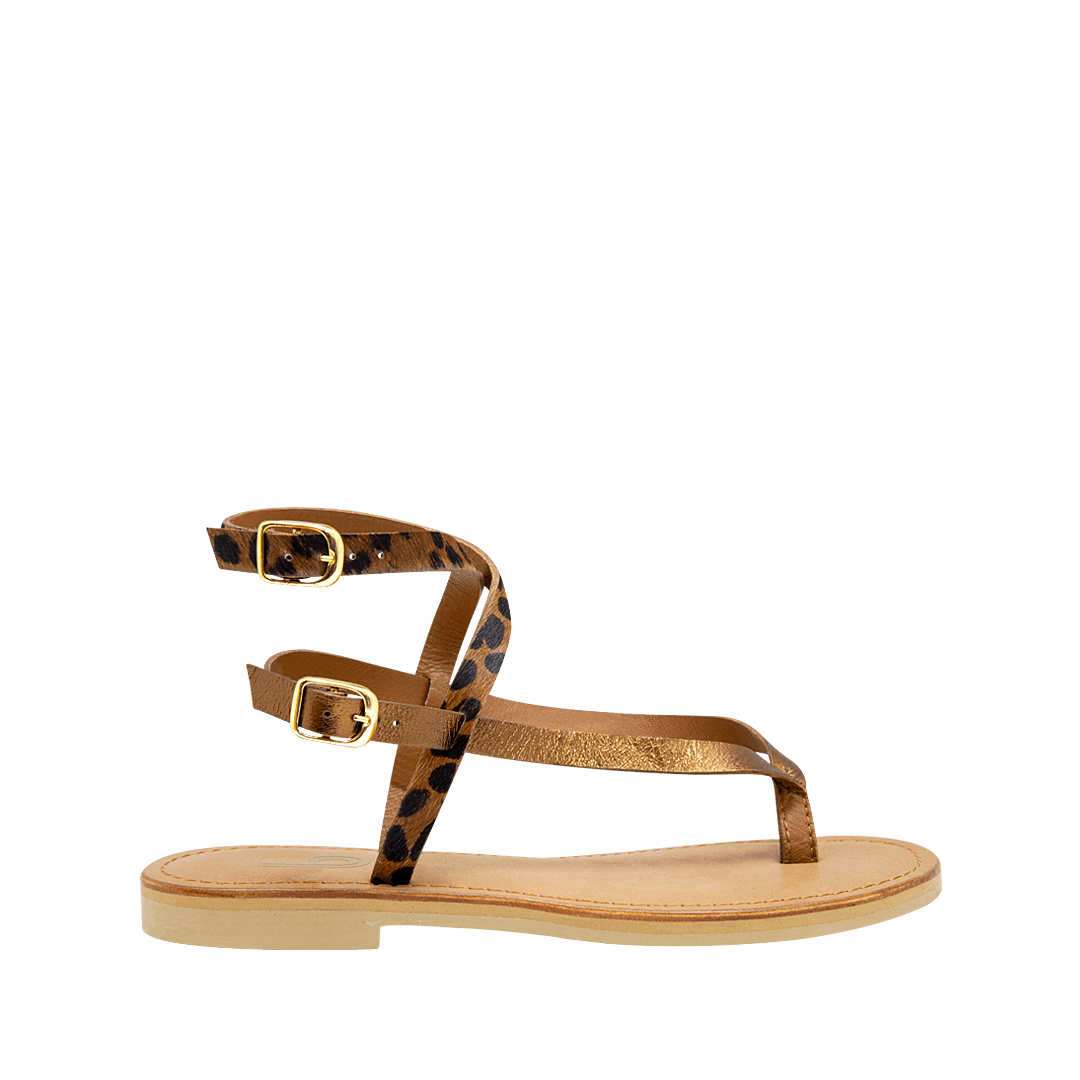 Sandalia plana en cuero luna con acabado en pelo leopardo