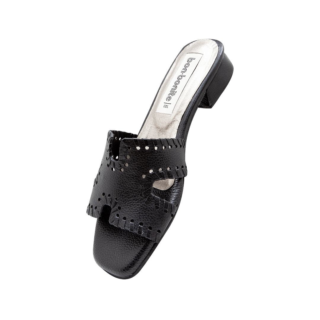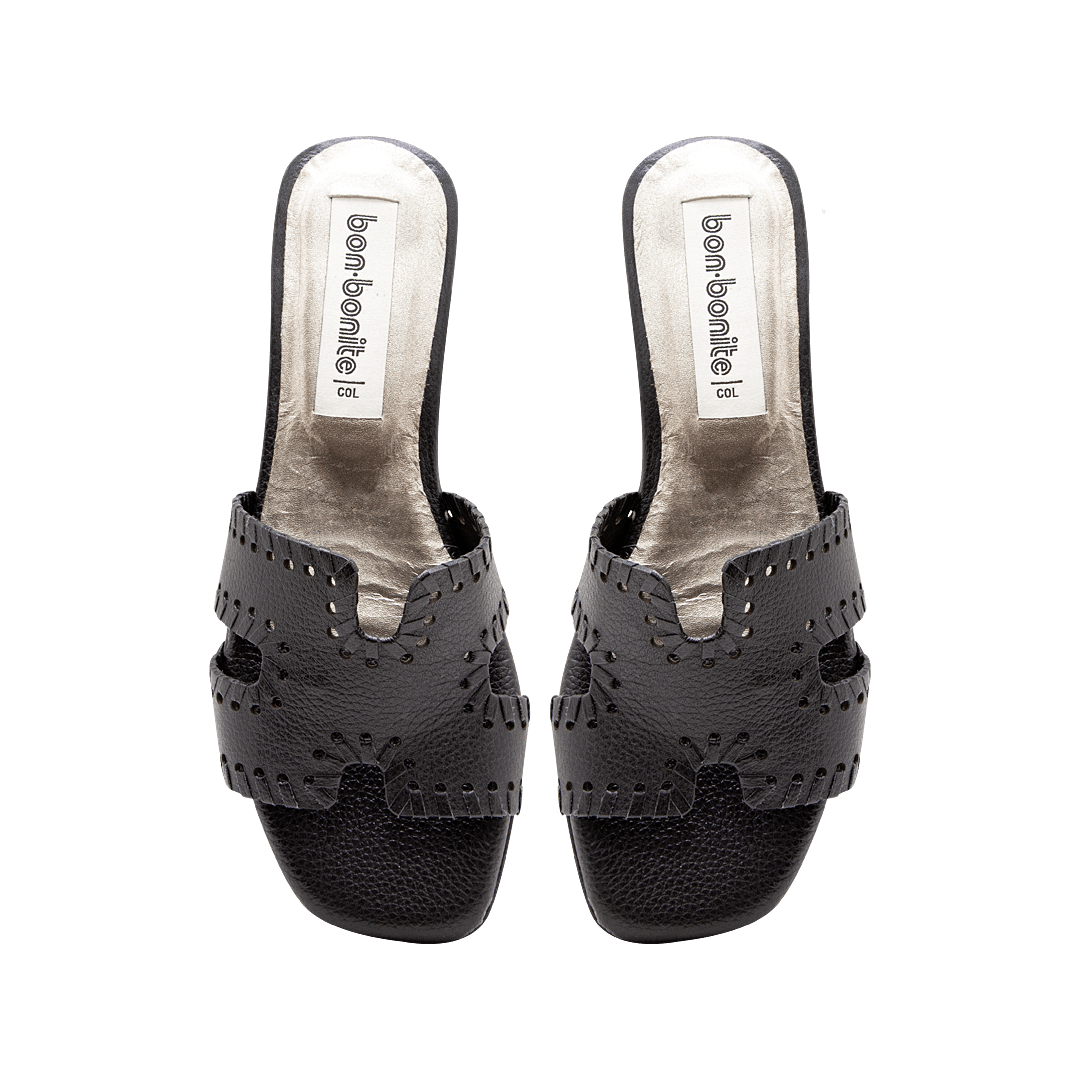¡Fresca y relajada! • Sandalia plana para mujer en cuero granito color negro ónix con pespunte • Acabado en punta ovalada • Mini tacón forrado en cuero • Hecho a mano en Colombia.