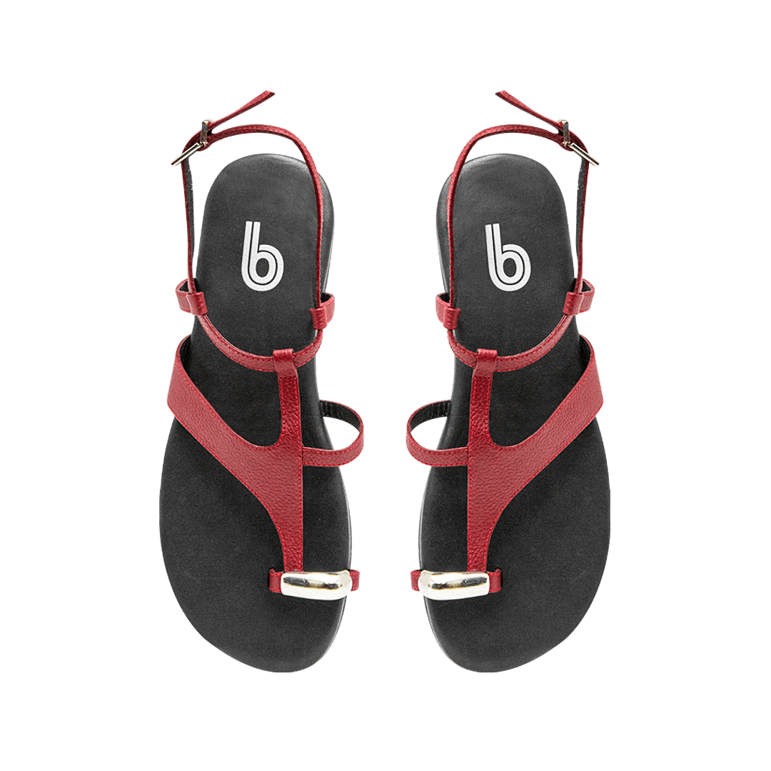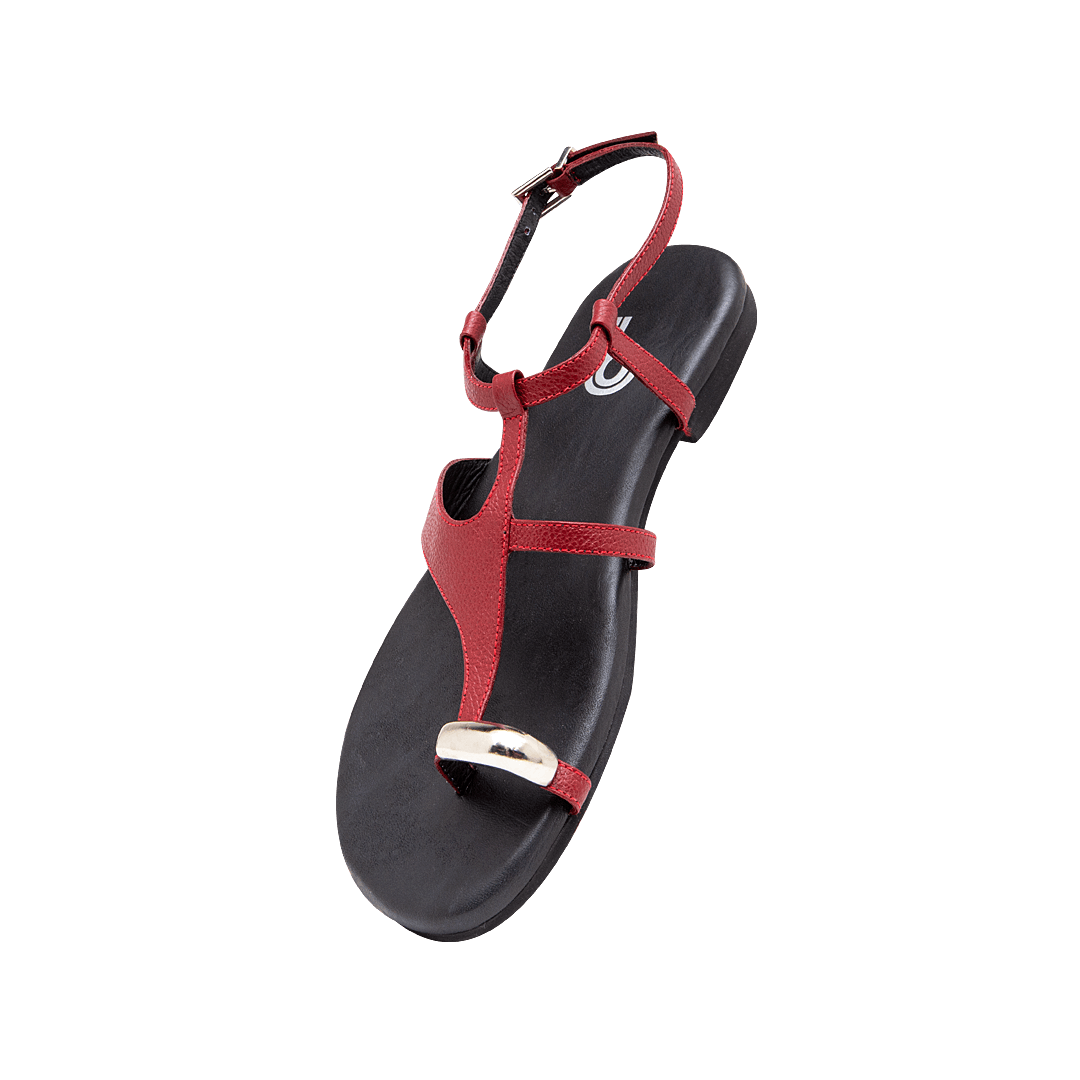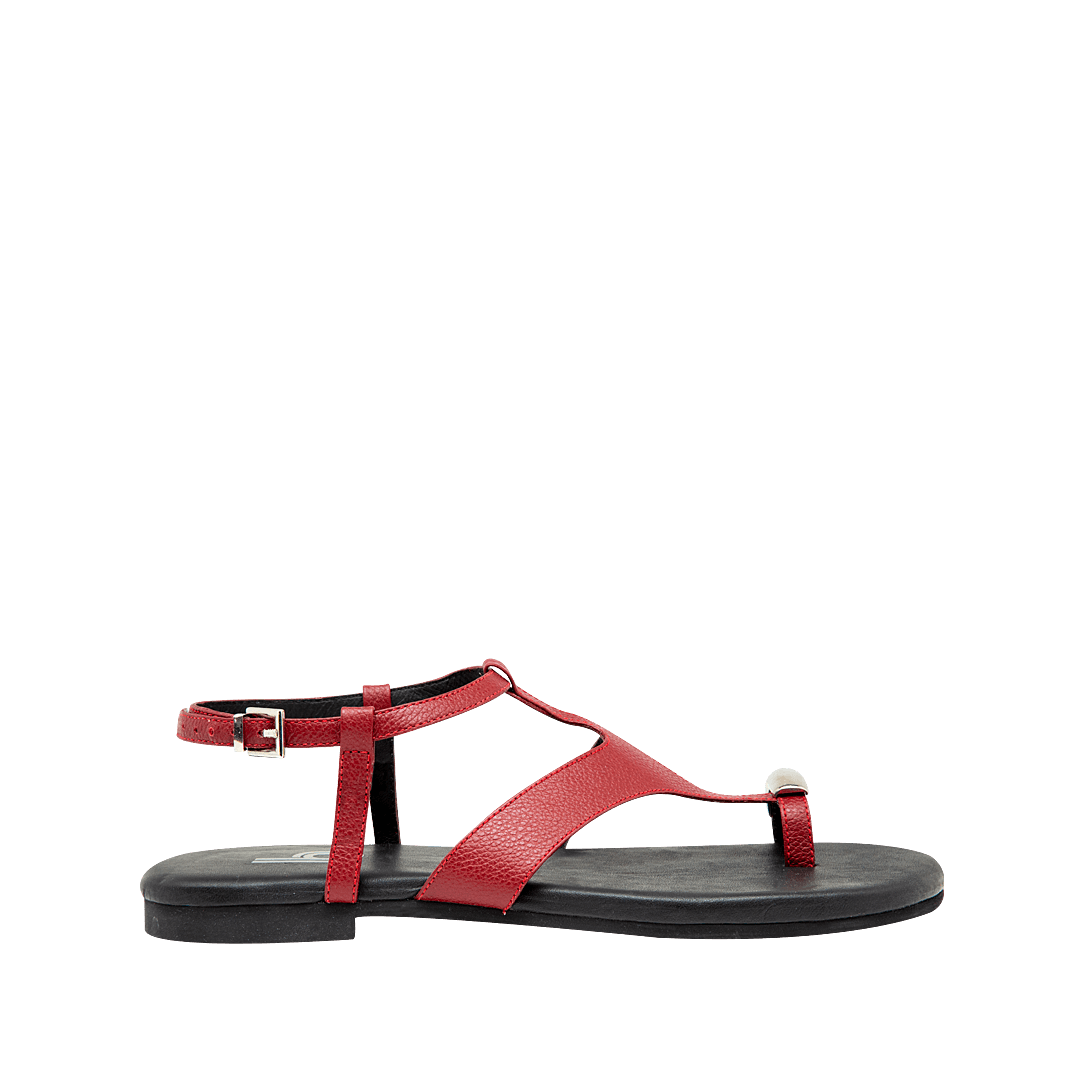 ¡Delicadas, pero con mucha actitud! • Sandalia plana para mujer en cuero granito color rojo cereza • Capellada en tiras • Acabado en punta ovalada • Hebilla lateral para mejor ajuste • Aplique metálico decorativo • Hecho a mano en Colombia.