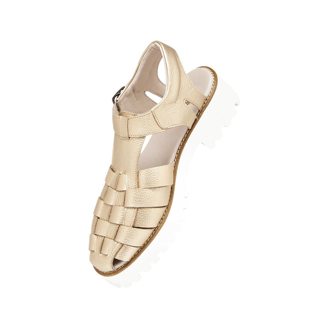 ¡Auténtica, juvenil y con mucha personalidad! • Sandalia tipo cangrejera para mujer en cuero metalizado color oro nuevo • Capellada en cuero entrelazado • Acabado en punta ovalada • Hebilla lateral para mejor ajuste • Plataforma tractorada • Hecho a mano en Colombia.