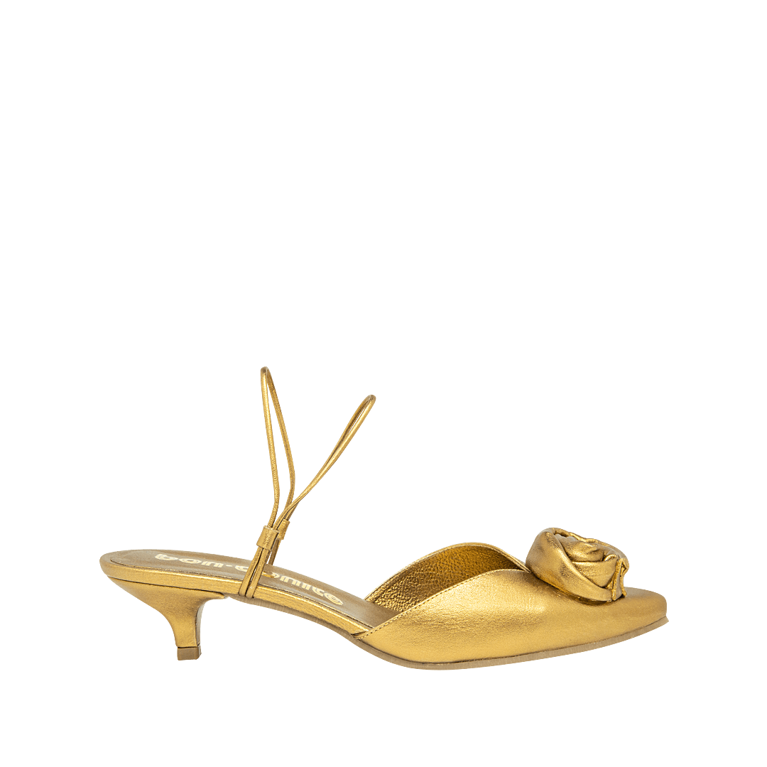 ¡Pasos glamurosos! • Tacón para mujer en cuero metalizado color bronce con flor decorativa en la capellada • Acabado en punta • Tacón forrado en cuero • Hecho a mano en Colombia.