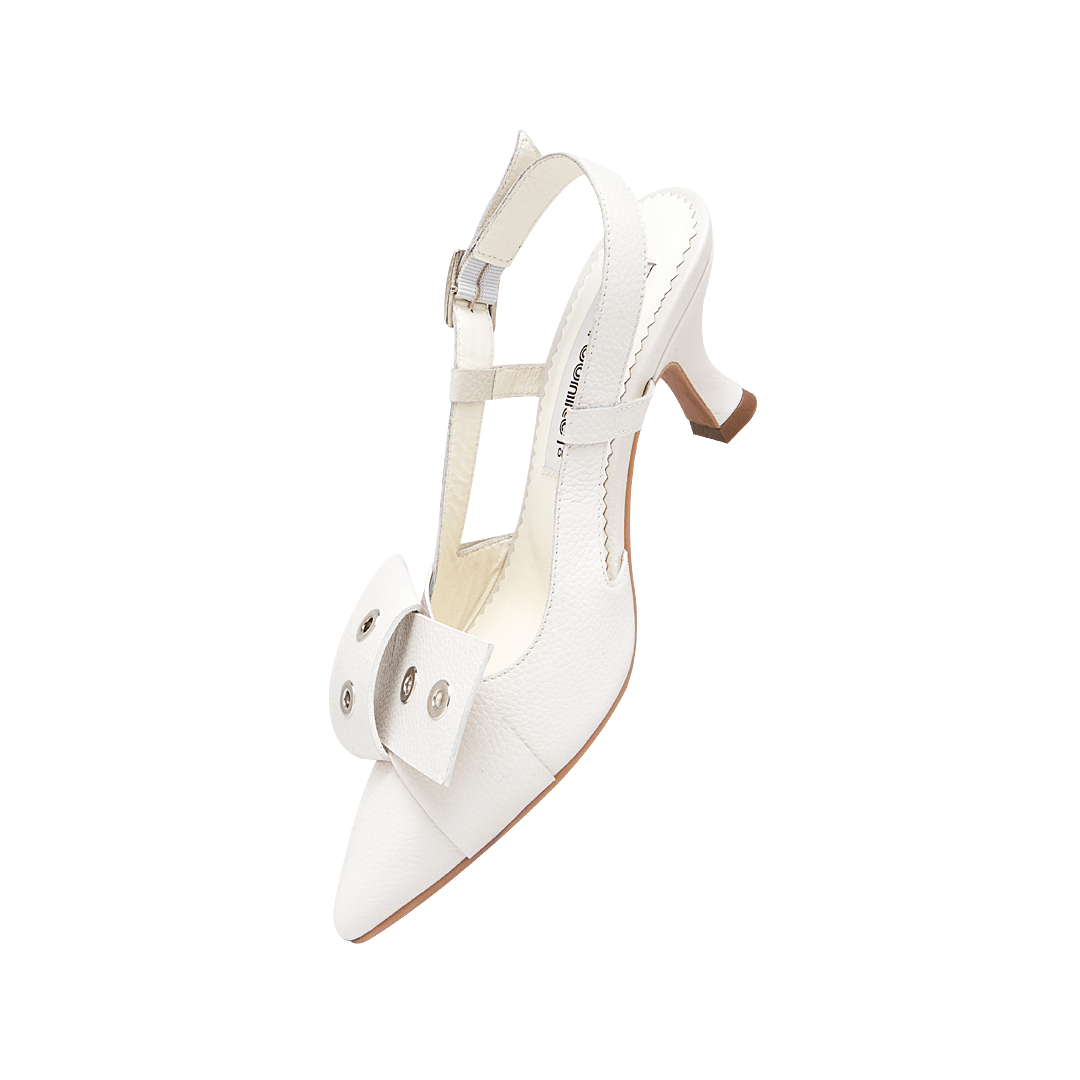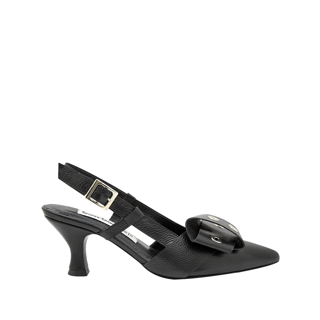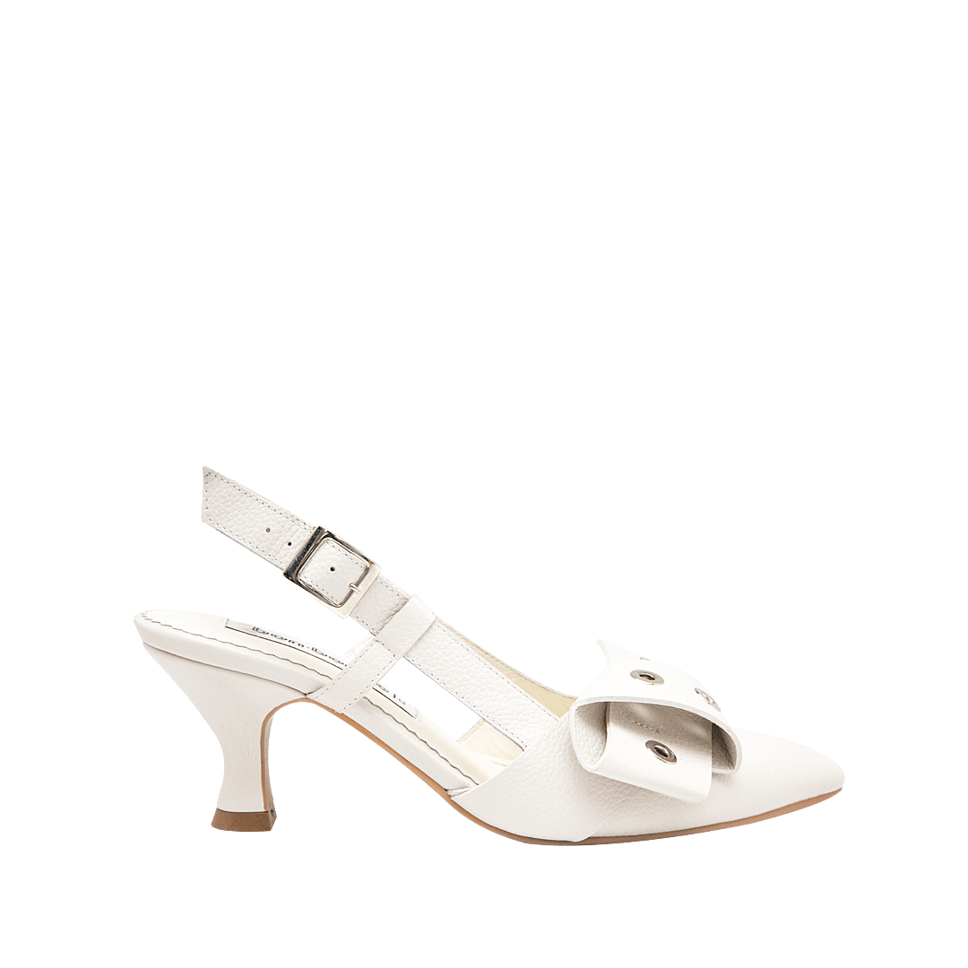 ¡Un par de tacones que cuentan tu historia de estilo! • Tacón con moño para mujer en cuero granito con ojaletes decorativos color duna • Acabado en punta • Hebilla lateral • Talón descubierto • Tacón forrado en cuero • Hecho a mano en Colombia.