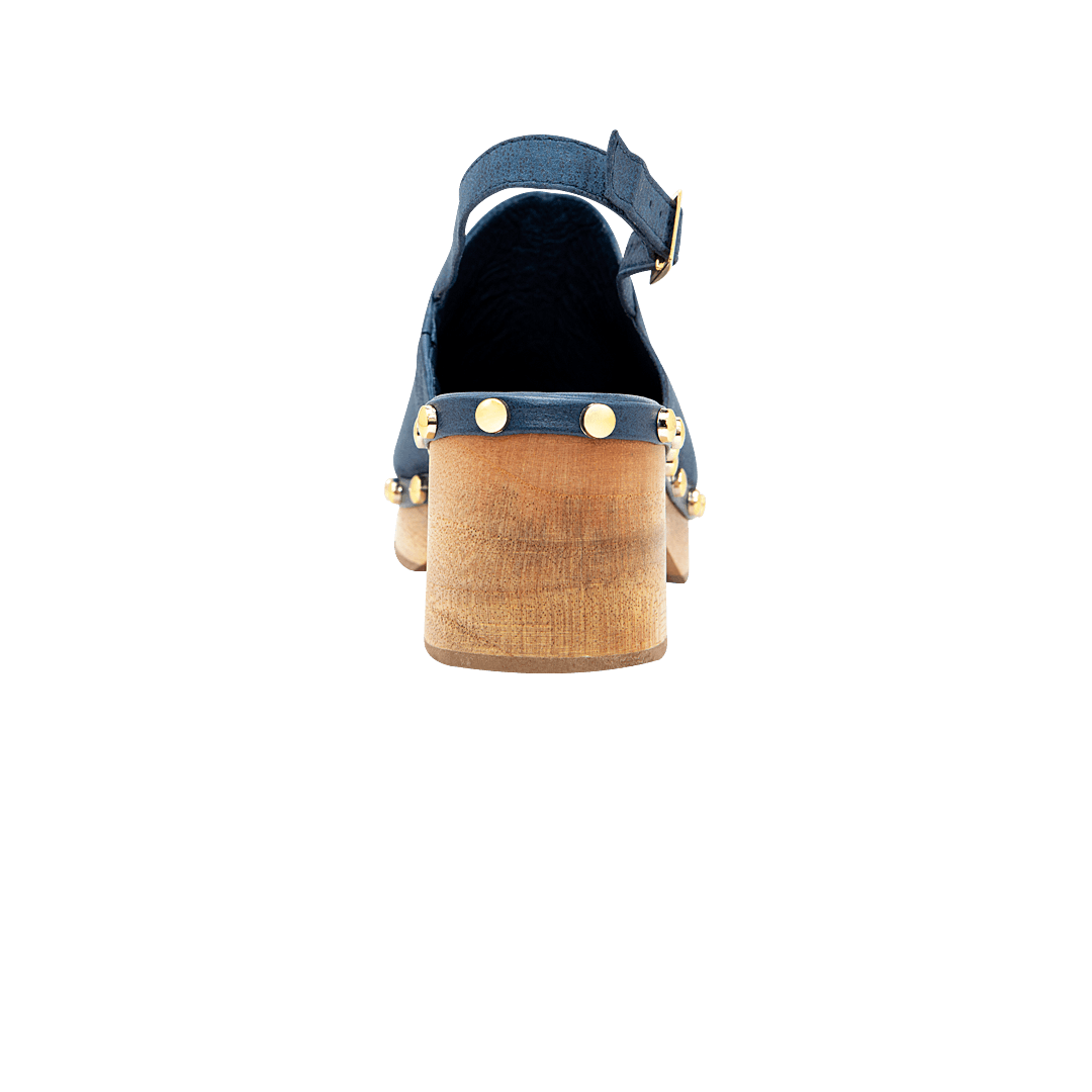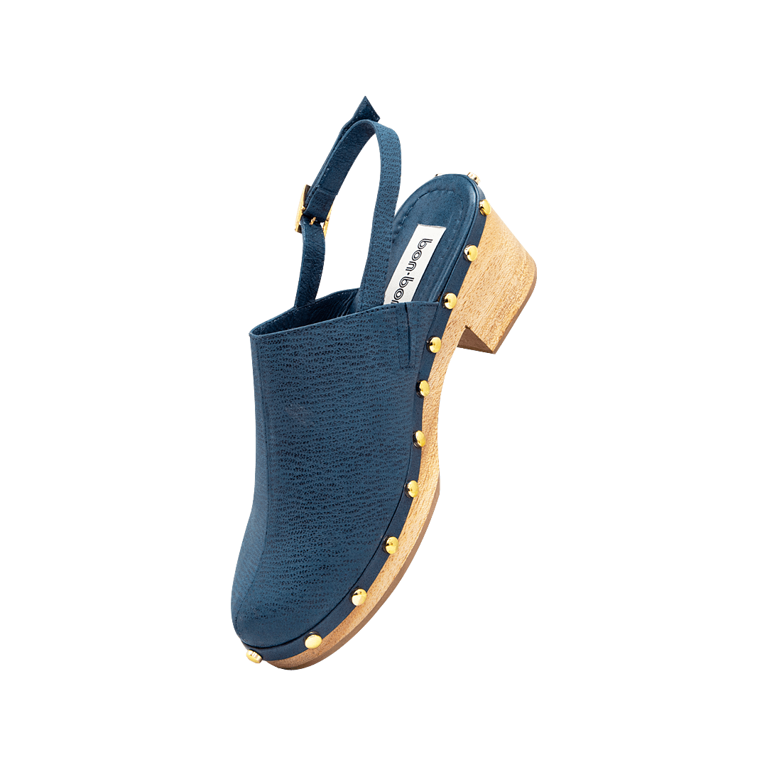 ¡No siguen tendencias, las inspiran! • Zueco para mujer en cuero nobuck color azul náutico con taches decorativos • Acabado en punta ovalada • Hebilla lateral para mejor ajuste • Tacón y plataforma en madera • Hecho a mano en Colombia.