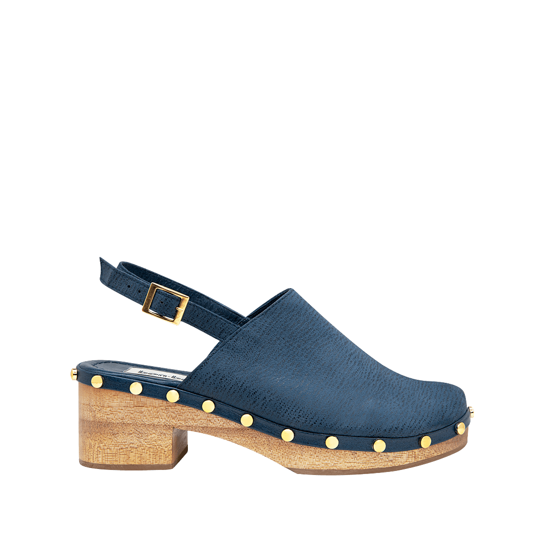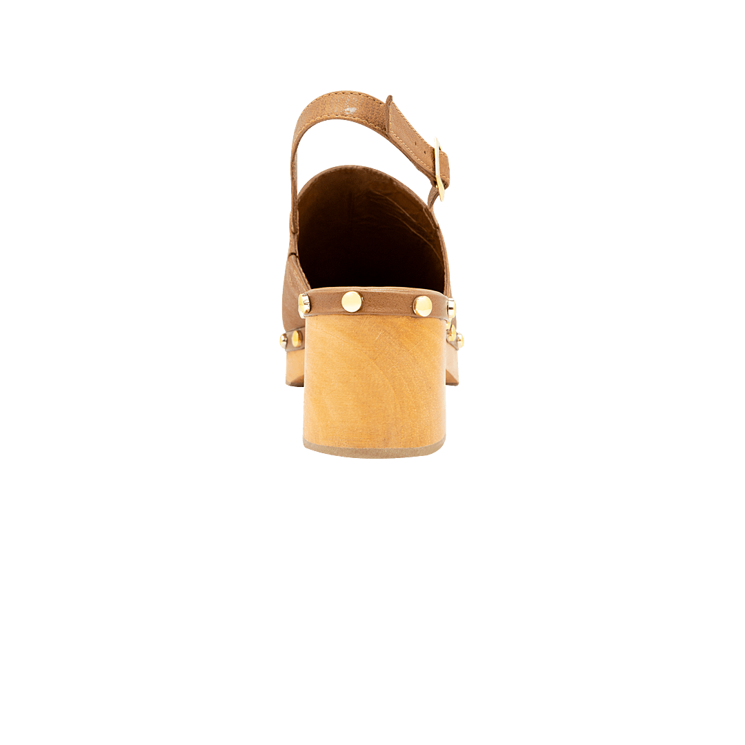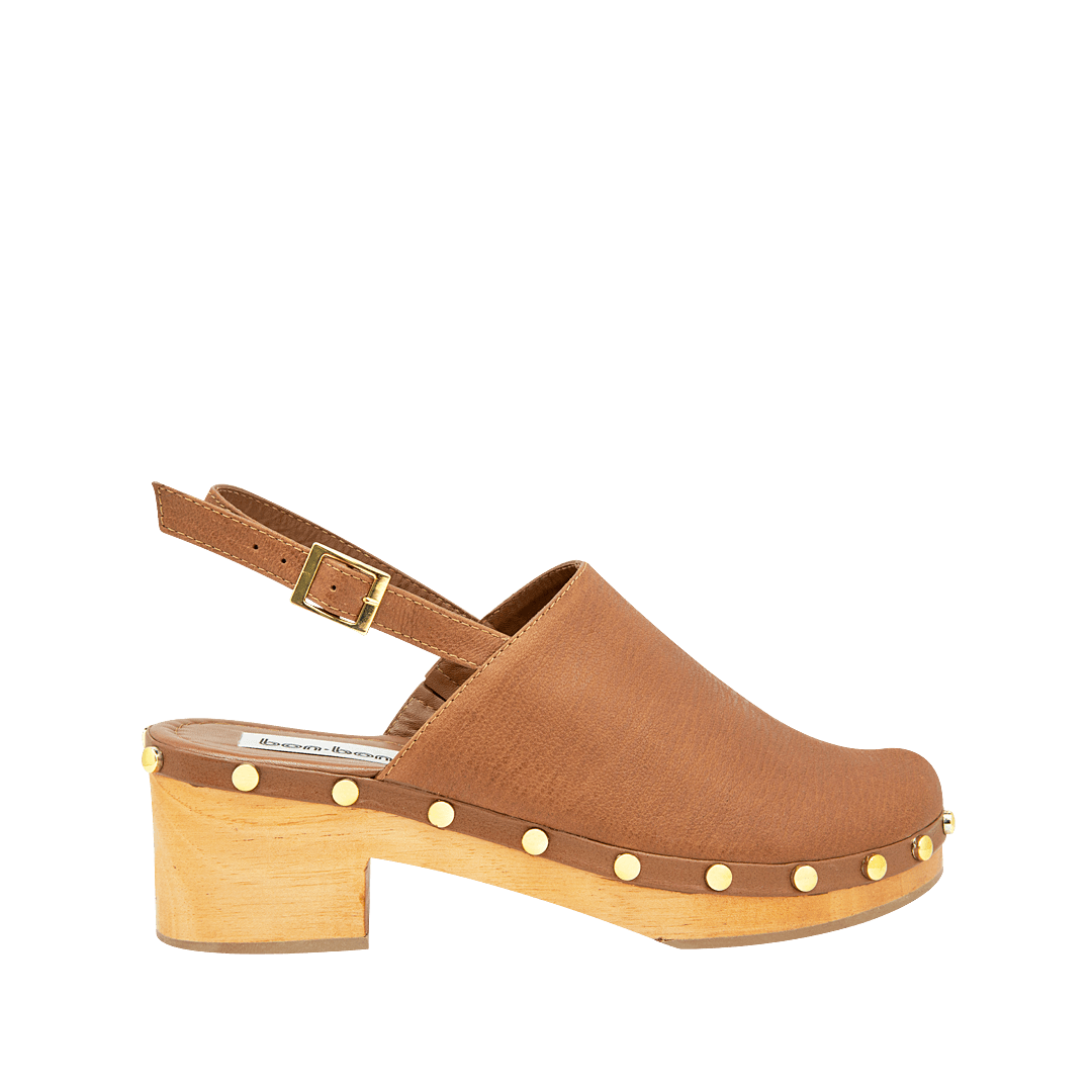 ¡No siguen tendencias, las inspiran! • Zueco para mujer en cuero nobuck color canela con taches decorativos • Acabado en punta ovalada • Hebilla lateral para mejor ajuste • Tacón y plataforma en madera • Hecho a mano en Colombia.