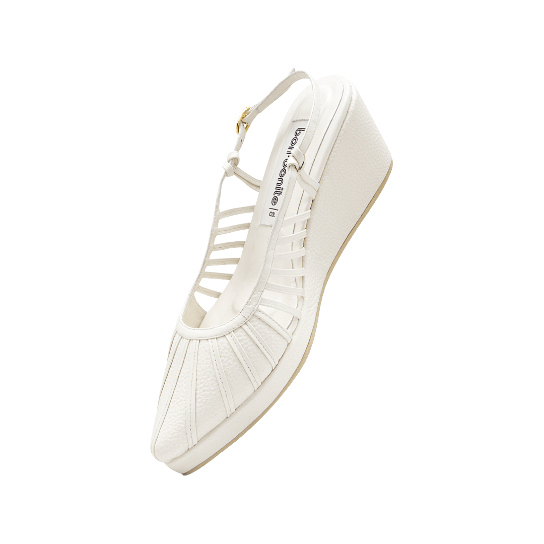 ¡Audaz y apasionada! • Tacón de plataforma para mujer con tiras laterales en cuero granito color blanco ostra • Acabado en punta • Hebilla lateral para mejor ajuste • Hecho a mano en Colombia.
