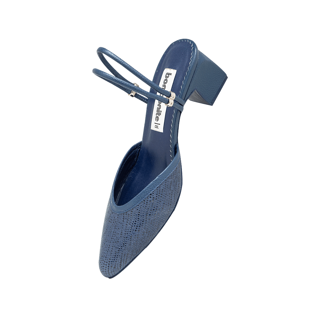 ¡Tacones diseñados para moverte con gracia y confianza! • Tacón para mujer en cuero grabado color azul náutico • Acabado en punta • Tacón forrado en cuero • Hecho a mano en Colombia.