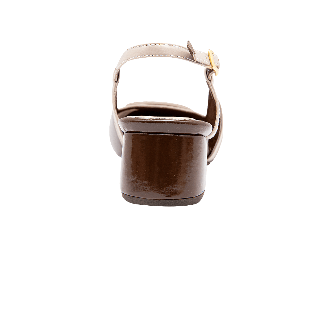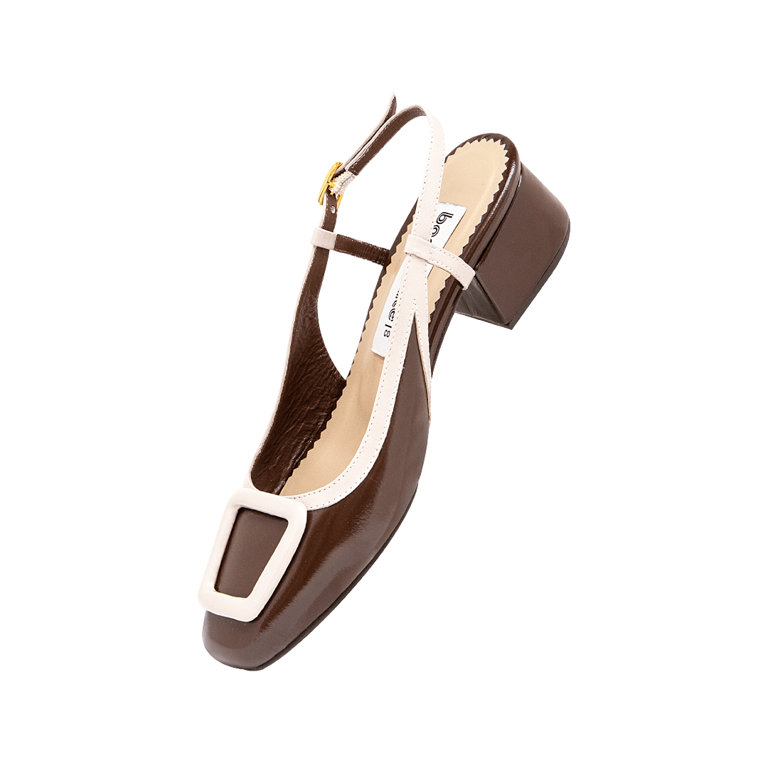 ¡Un clásico infaltable! • Tacón en cuero charol color cacao por blanco arena • Acabado en punta ovalada • Hebilla lateral • Talón descubierto • Tacón forrado en cuero charol • Hecho a mano en Colombia.