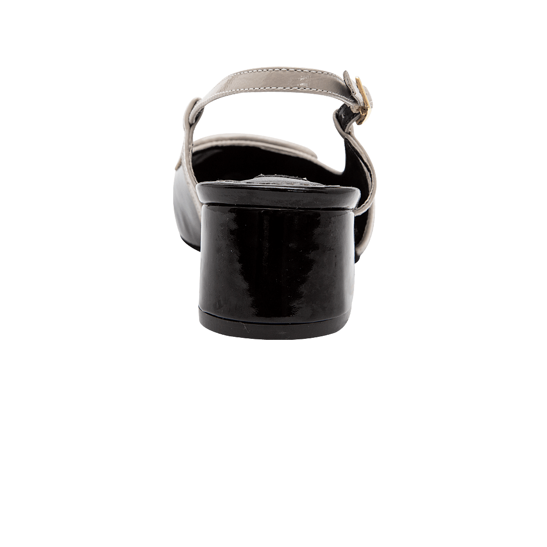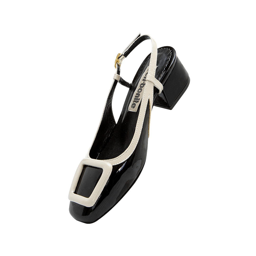 ¡Un clásico infaltable! • Tacón en cuero charol color negro ónix por blanco arena • Acabado en punta ovalada • Hebilla lateral • Talón descubierto • Tacón forrado en cuero charol • Hecho a mano en Colombia.