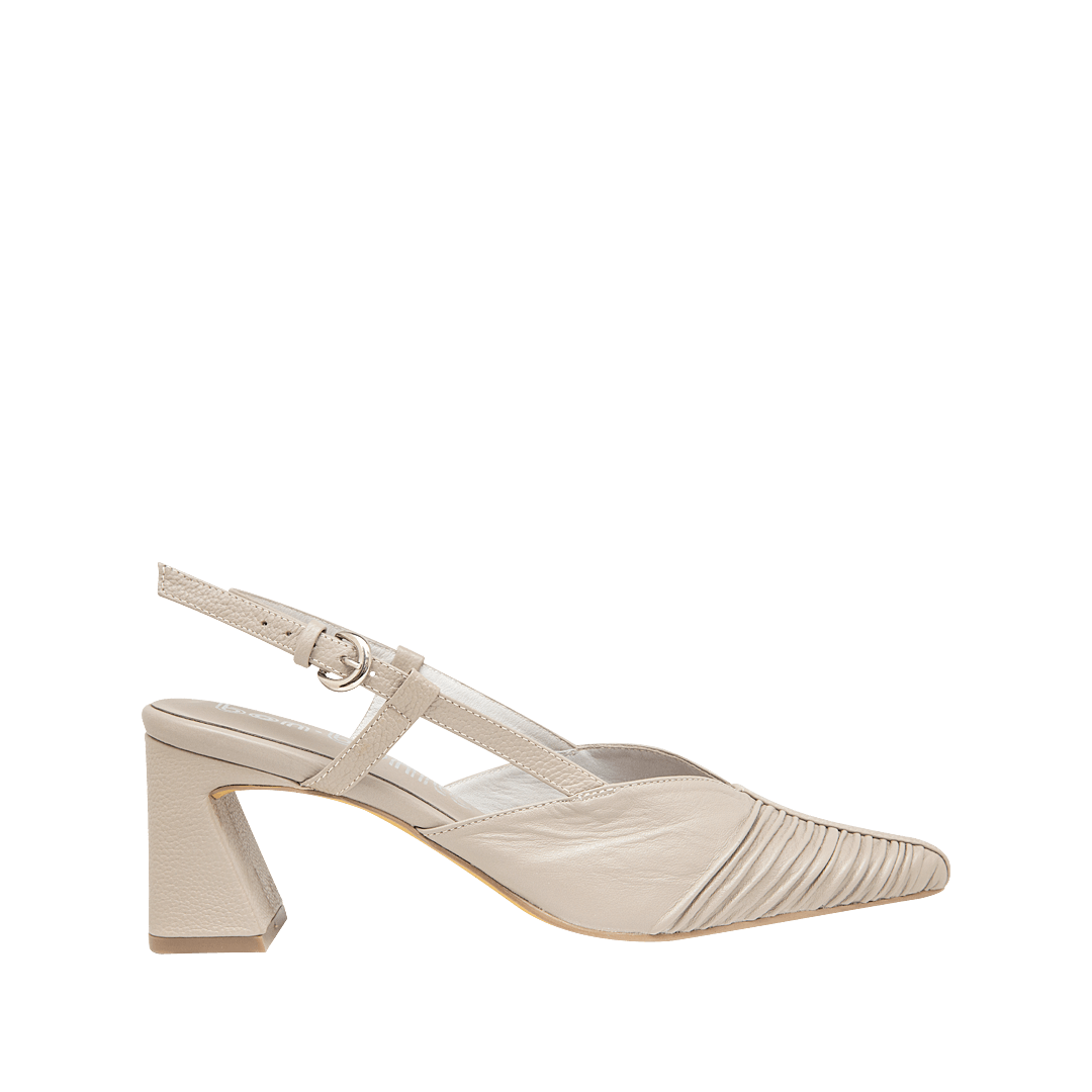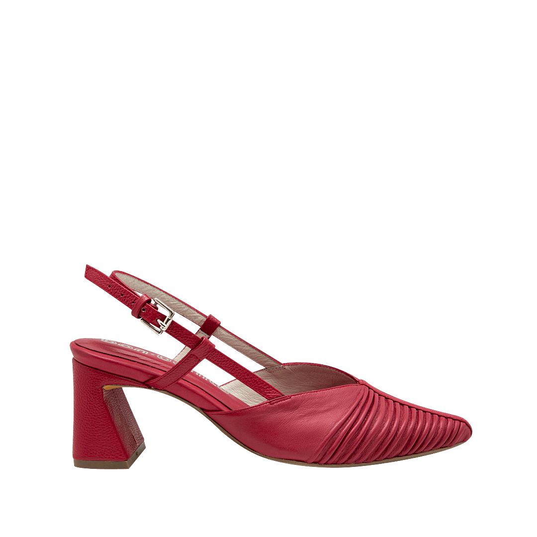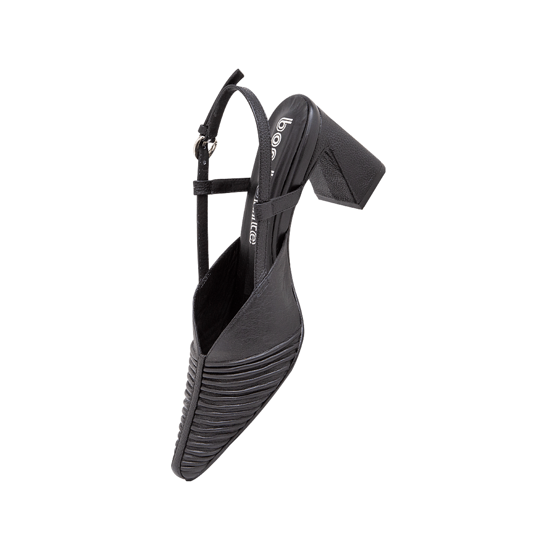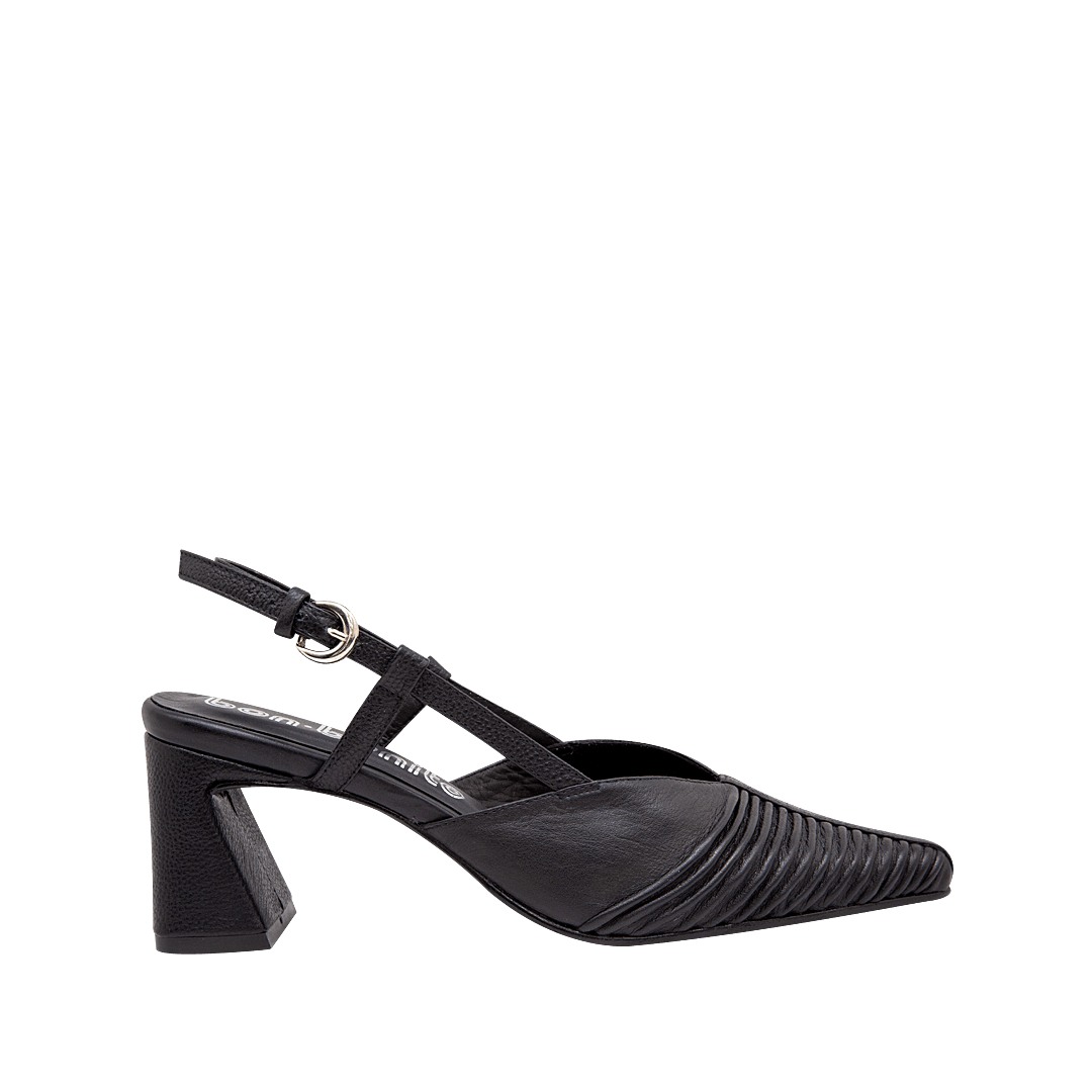 ¡Donde tu estilo y tu comodidad se encuentran! • Tacón para mujer en cuero drapeado confección color negro ónix • Acabado en punta • Hebilla lateral para mejor ajuste • Hecho a mano en Colombia.
