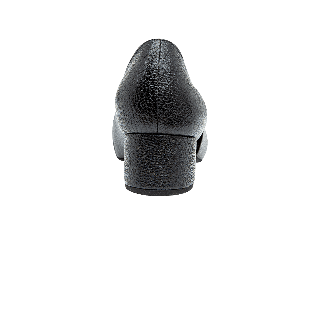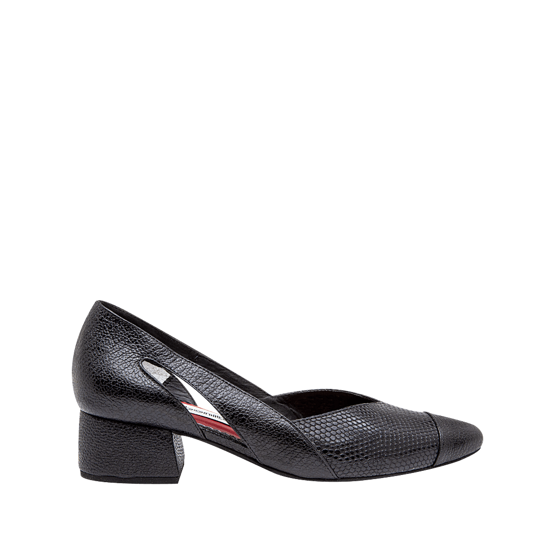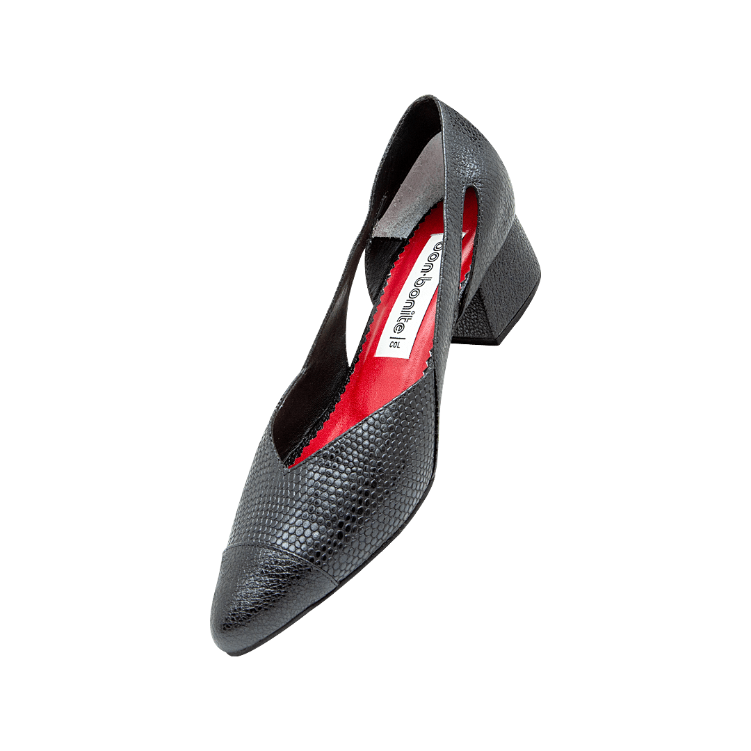 ¡Tacones diseñados para moverte con gracia y confianza! • Tacón para mujer en cuero grabado color negro ónix • Acabado en punta • Escotes laterales •Tacón forrado en cuero • Hecho a mano en Colombia.