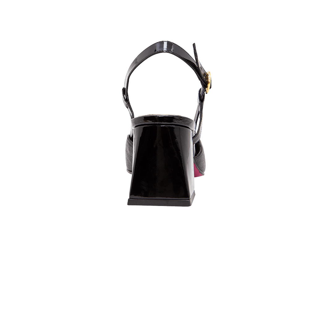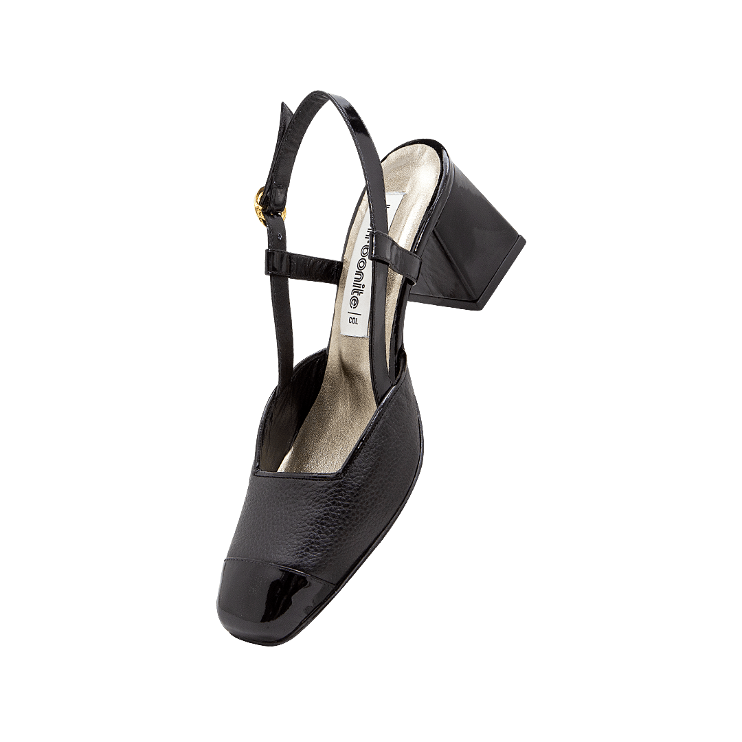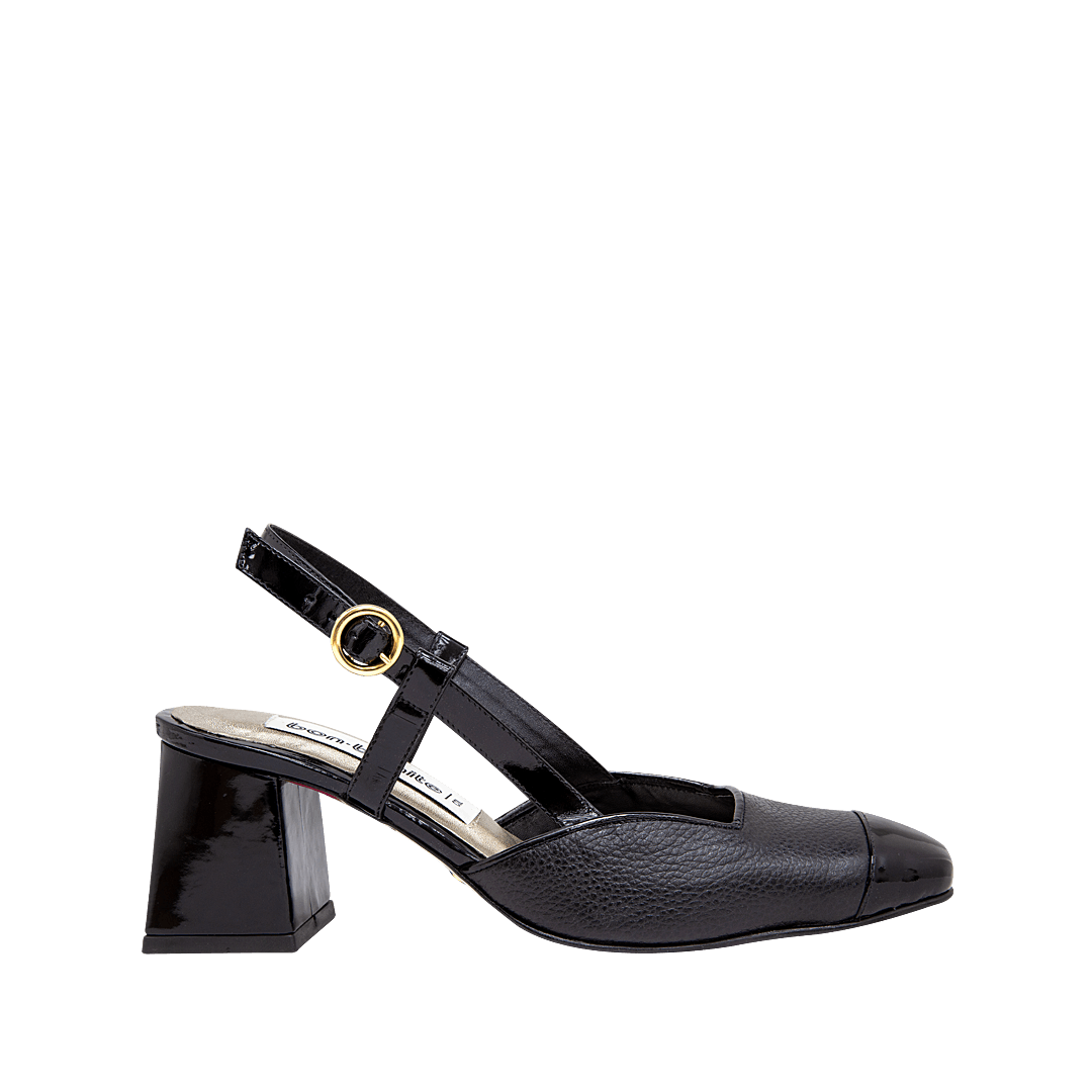 ¡Clásicos y versátiles! • Tacón para mujer en cuero granito color negro ónix • Puntera charolada cuadrada • Escote geométrico • Hebilla lateral • Talón descubierto • Tacón forrado en cuero charolado • Hecho a mano en Colombia.