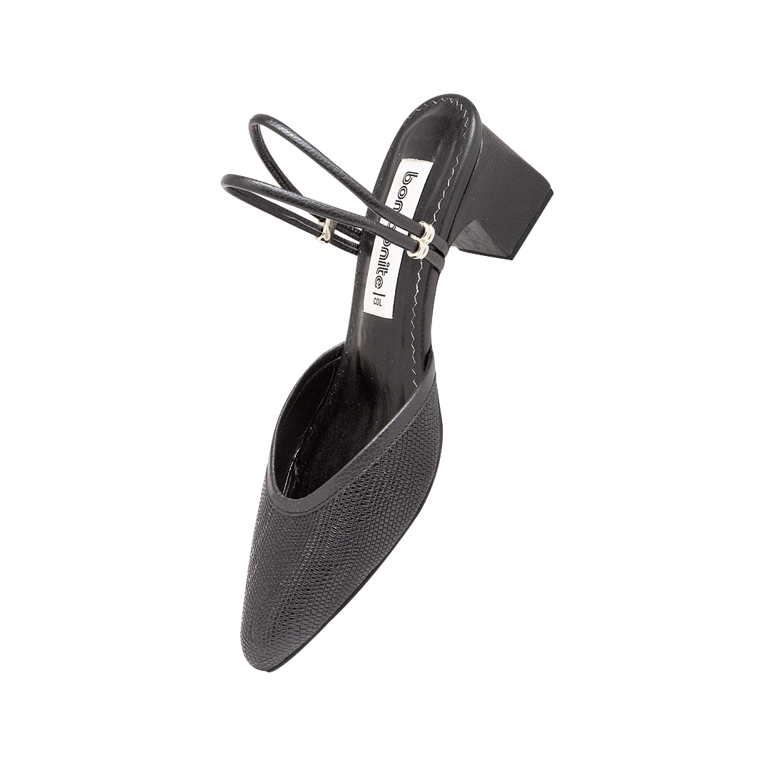 ¡Tacones diseñados para moverte con gracia y confianza! • Tacón para mujer en cuero grabado color negro ónix • Acabado en punta • Tacón forrado en cuero • Hecho a mano en Colombia.
