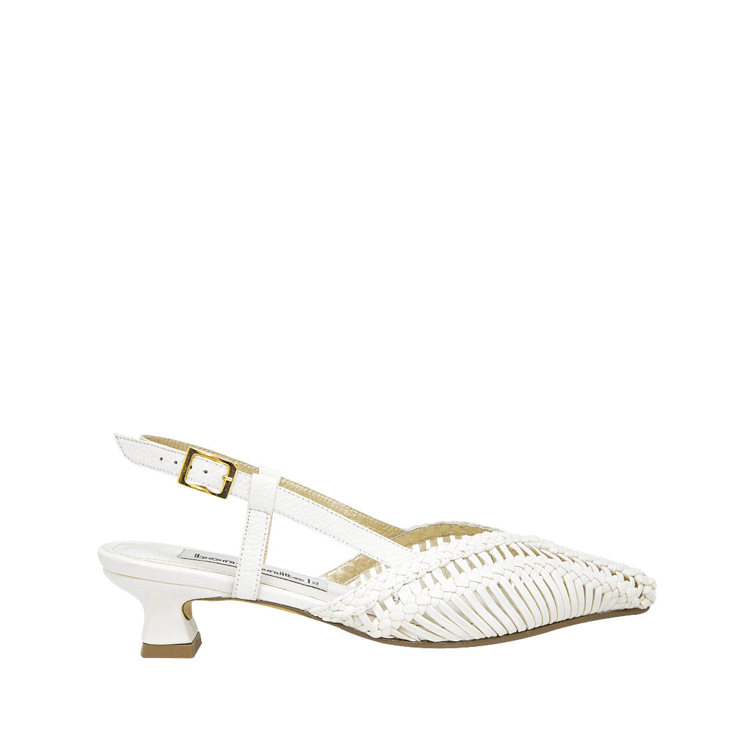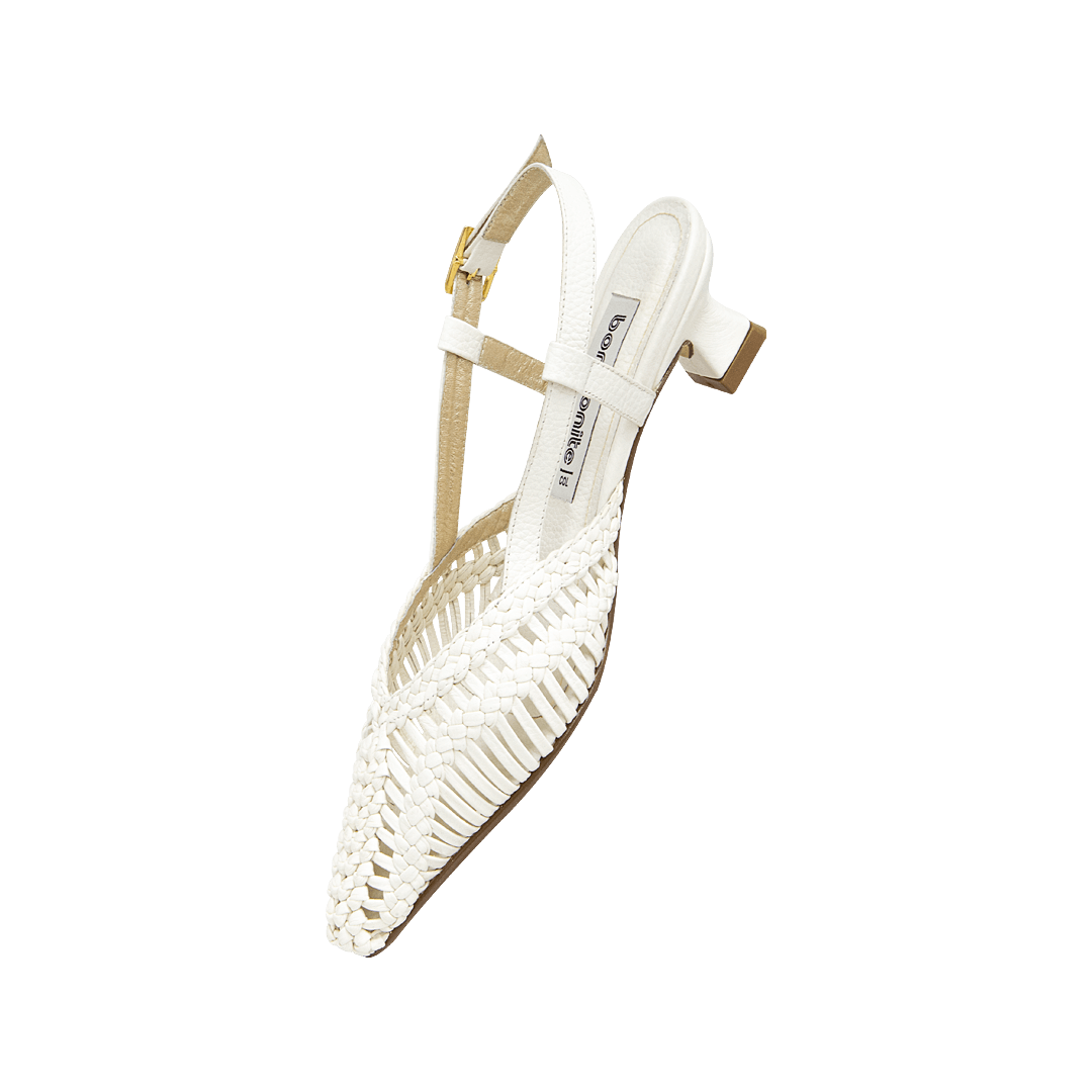 ¡Perfecto para destacar! • Tacón tipo stiletto para mujer en cuero trenzado color chantilly • Acabado en punta • Hebilla lateral • Tacón forrado en cuero • Hecho a mano en Colombia.