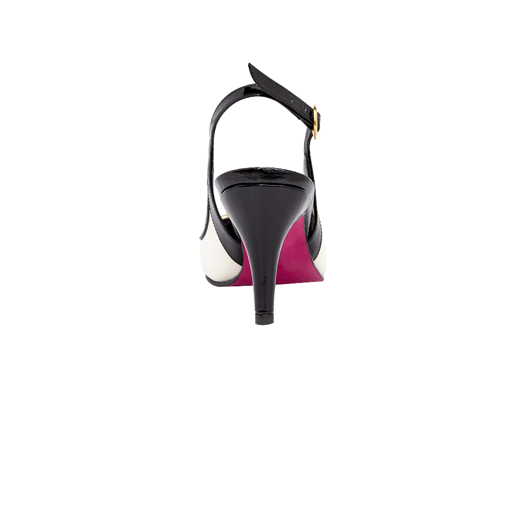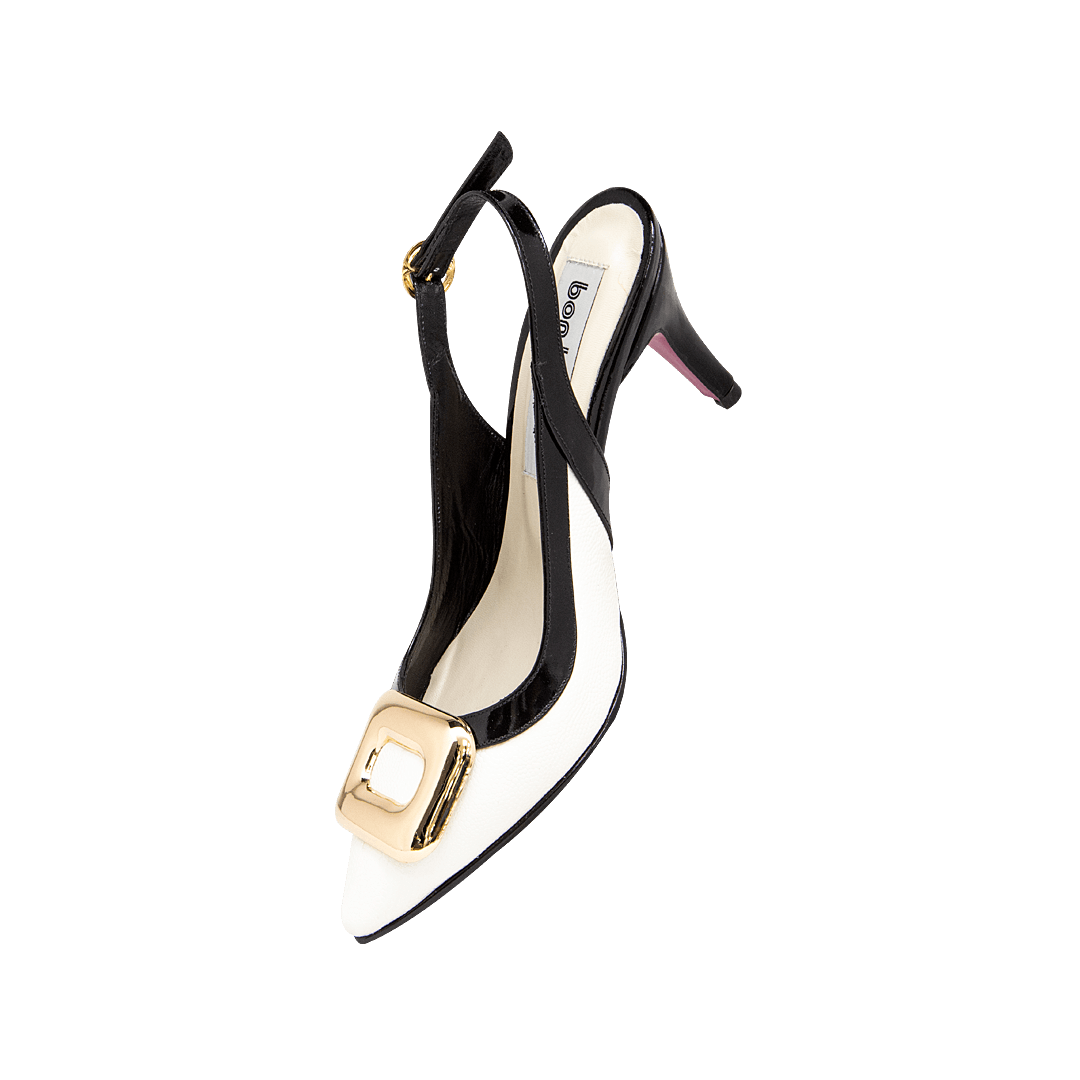 ¡Tu nuevo favorito! • Tacón tipo stiletto para mujer color blanco tiza por negro ónix • Herraje en la capellada • Acabado en punta • Hebilla lateral para mejor ajuste • Tacón forrado en cuero • Hecho a mano en Colombia.