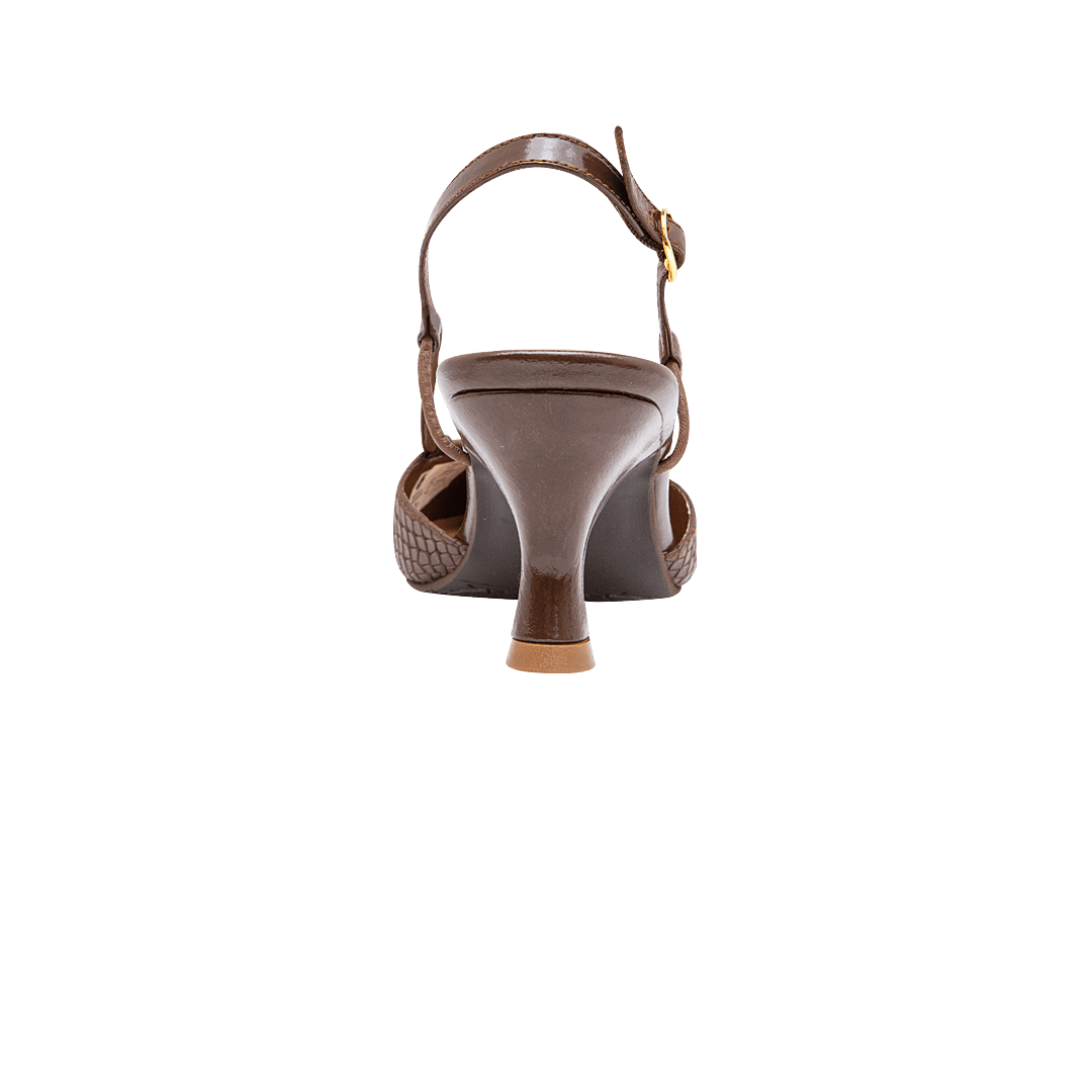 ¡Tacón medio que estiliza sin comprometer la comodidad! • Tacón para mujer tipo stiletto en cuero grabado color cacao • Acabado en punta • Hebilla lateral para mejor ajuste • Tacón forrado en cuero • Hecho a mano en Colombia.