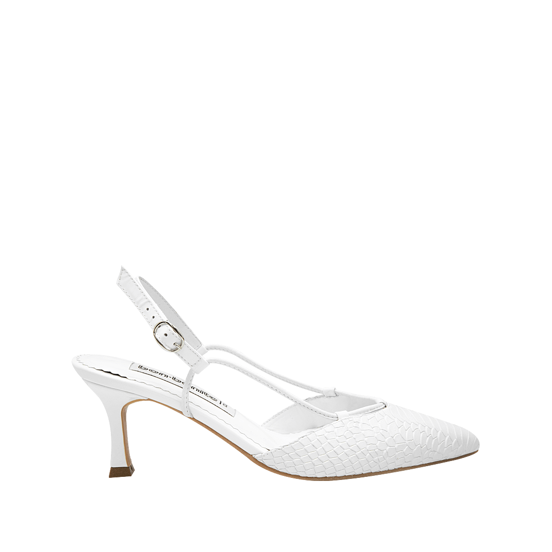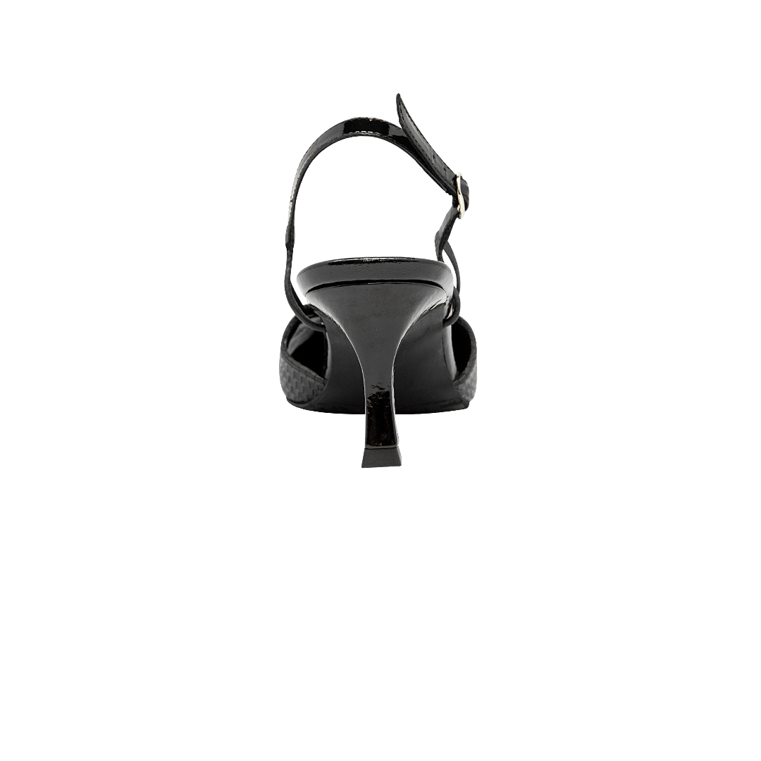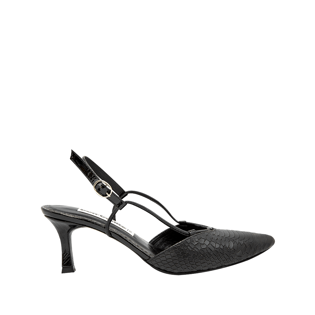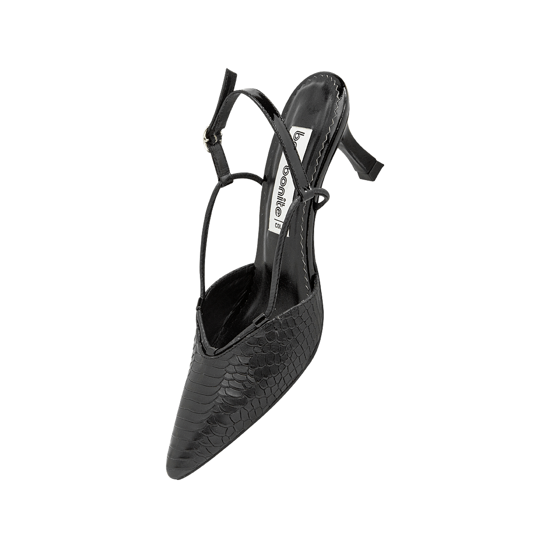 ¡Tacón medio que estiliza sin comprometer la comodidad! • Tacón para mujer tipo stiletto en cuero grabado color negro ónix • Acabado en punta • Hebilla lateral para mejor ajuste • Tacón forrado en cuero • Hecho a mano en Colombia.