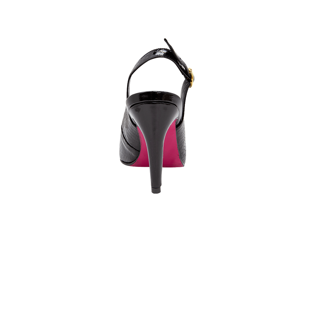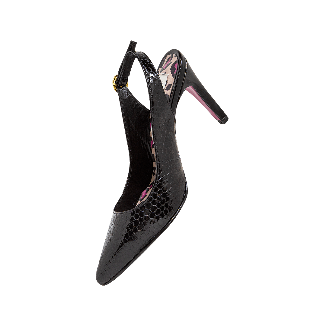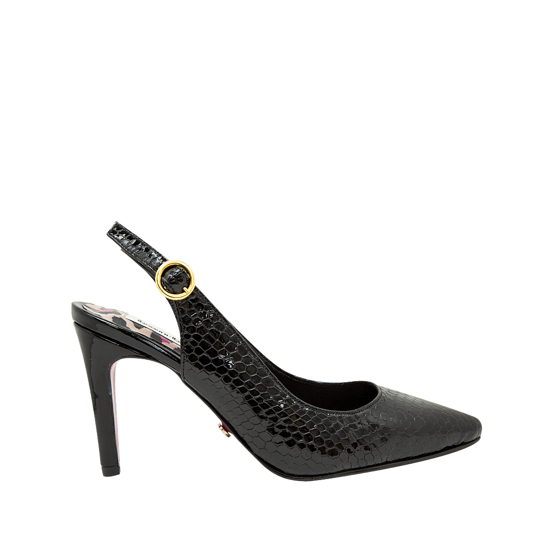 ¡Elegancia y estilo! • Tacón para mujer tipo stiletto en cuero charolado color negro ónix • Acabado en punta • Hebilla lateral para mejor ajuste • Tacón geométrico forrado en cuero • Hecho a mano en Colombia.