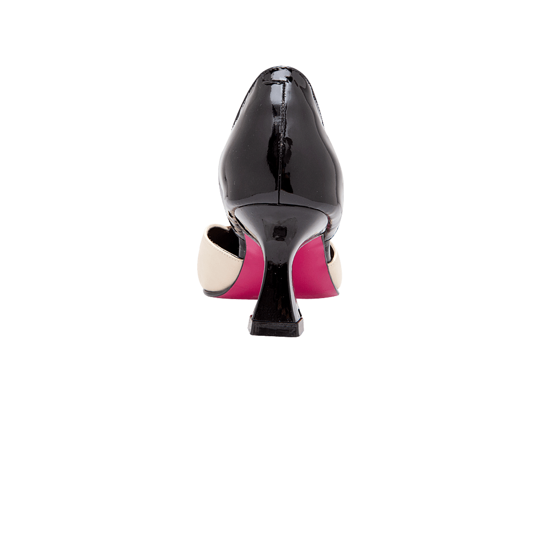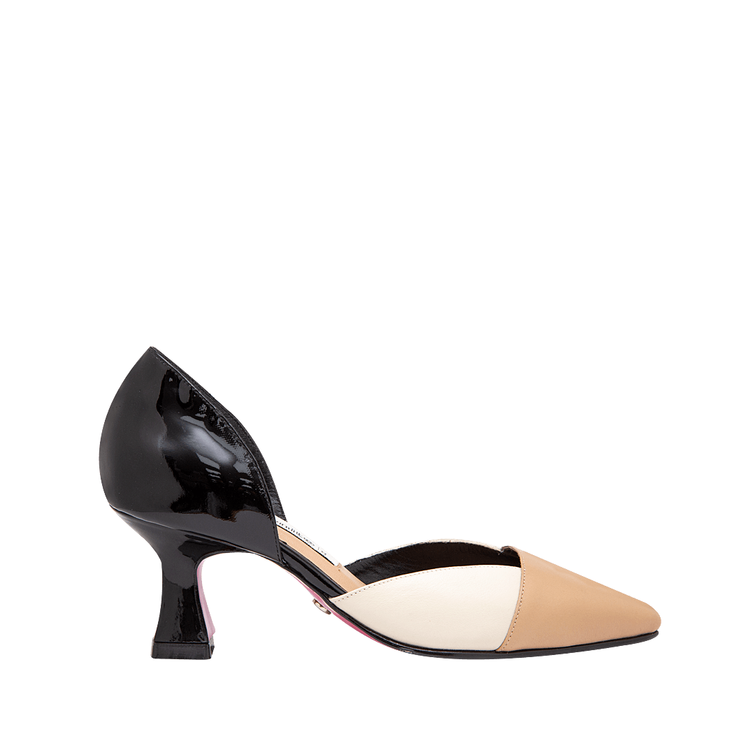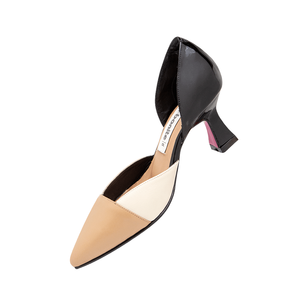 ¡Tacones diseñados para moverte con gracia y confianza! • Tacón para mujer tipo stiletto en mezcla de cuero charol y liso color negro ónix por capuccino y duna • Acabado en punta • Tacón forrado en cuero charol • Hecho a mano en Colombia.