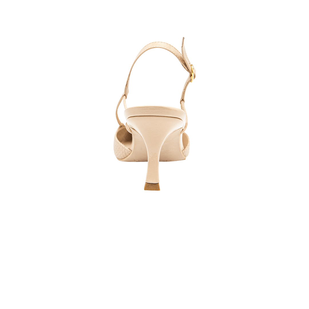 ¡Tacón medio que estiliza sin comprometer la comodidad! • Tacón para mujer tipo stiletto en cuero grabado color rosa nude • Acabado en punta • Hebilla lateral para mejor ajuste • Tacón forrado en cuero • Hecho a mano en Colombia.
